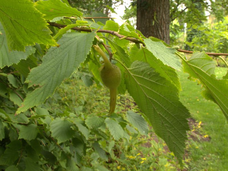 Morfoloģija. Dzinumi ir brūni, ar matiņiem, kamēr jauni. Lenticeles parādās vēlāk. Lapas ir veselas, tumši zaļas, ovālas vai otrādi olveida, 6-12 cm garas, 4-8 cm platas, galos ar īsu smaili, ar apaļu vai maz izteiktu sirdsveida pamatni, viegli zobainu malu, virspusē kailas, bet apakšpuse nedaudz mataina. Lapas kāts ir 1,5 cm garš, ar matiņiem. Vīrišķās ziedkopas kopā pa 2-3, tās ir 2,5 cm garas un 0,5 cm platas. Zied aprīlī – maijā. Ziedi pa 2-6, to kāts 2,5 cm garš. Rieksti ir olveida, 1,5 cm gari.