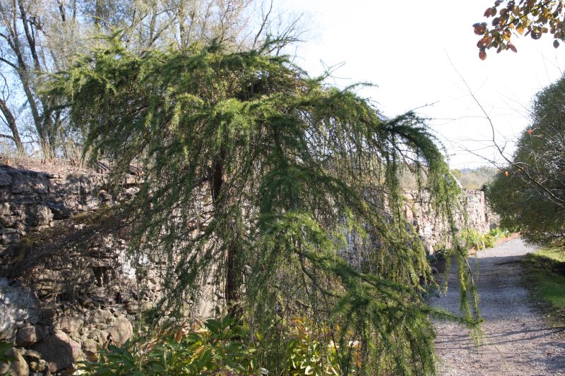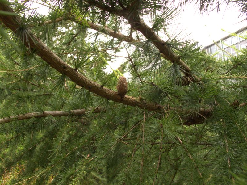 Morfoloģija. Vainags veciem kokiem ir varens. Tā kā otrās pakāpes zari ir nokareni un skujas samērā īsas, vainags ir skrajš. Dzinumi ir pelēcīgi dzelteni. Skujas ir zaļas un aug uz īsvasām pa 40-70. Skuju garums – 1,5-3 cm. Oktobra beigās tās ir dzeltenas. Jaunie čiekuri ir purpursarkani, 2-4 cm gari. Sēklas 3-4 mm garas, gaiši brūnas.
