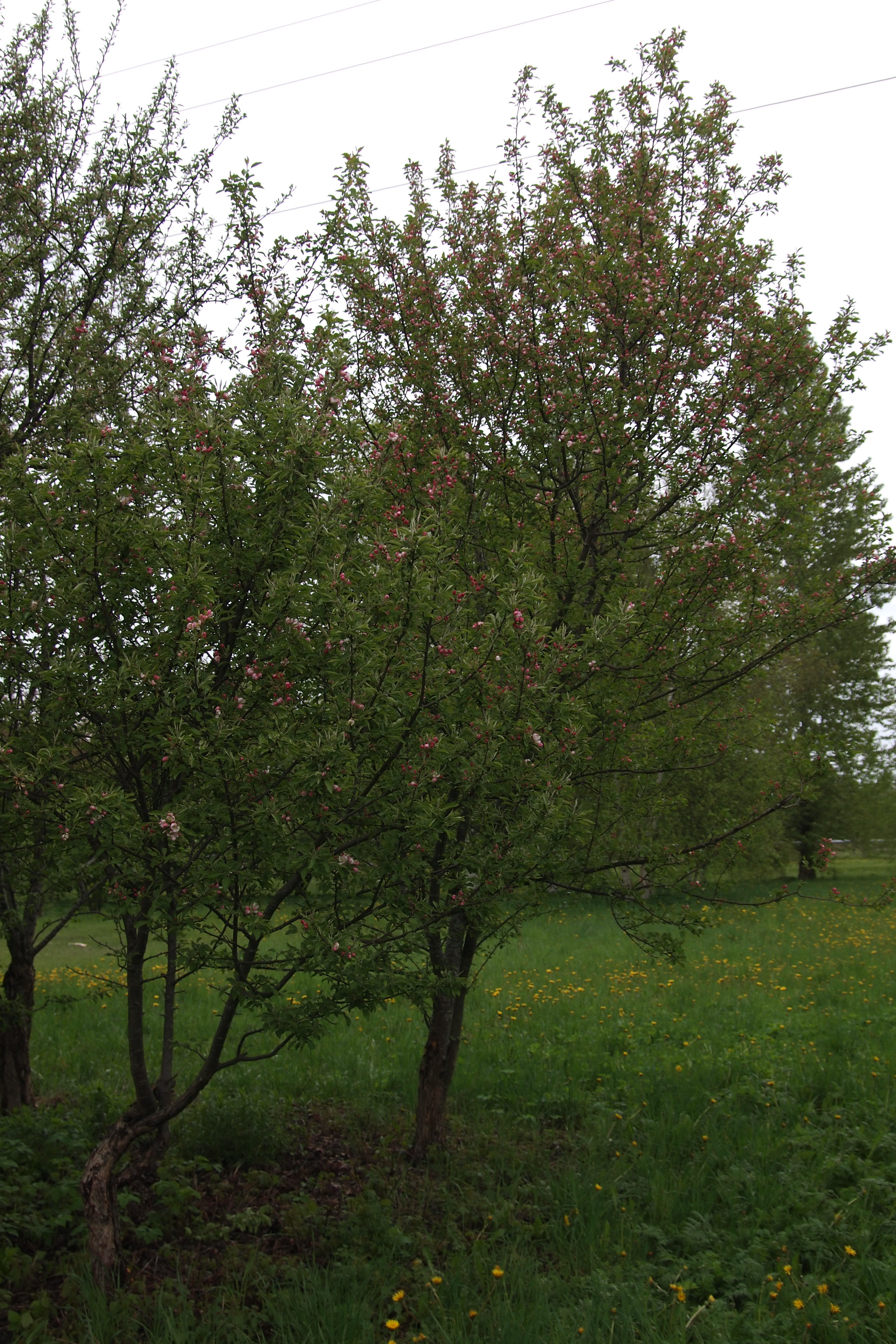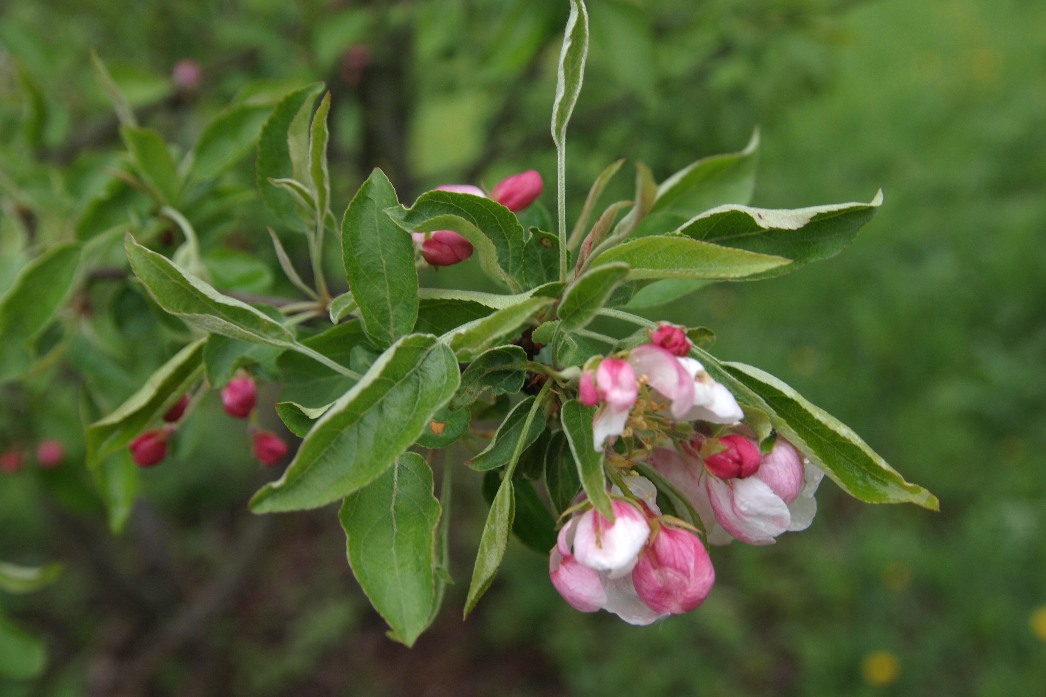 Morfoloģija. Mazs kociņš ar izplestu vainagu. Dzinumi vairāk vai mazāk pūkaini. Lapiņas ovālas, gari nosmailotas, ar gludu malu, uz garvasām robainas līdz daivainas, uz īsvasām veselas. Jaunām lapiņām apakšpuse pūkaina. Ziedi pumpuros purpurrozā, beidzot ziedēt balti. Augļu ļoti daudz, līdz 1 – 1,3 cm plati, koši sarkani, saglabājas visu ziemu.
