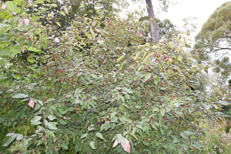 Morfoloģija. Pavasarī un vasaras sākumā lapas ir purpursarkanas, vēlāk tumši zaļas. Ziedi sarkani, zied maijā. Augļi ir rudenī, sarkani.