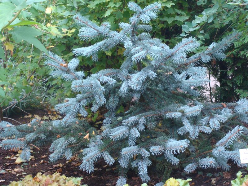 Morfoloģija. Vainags ir biezs, tam ir plata konusa forma. Zari ir horizontāli. Dzinumu gali stāvi. Skujas sudrabaini zilas, stingras, asas.
