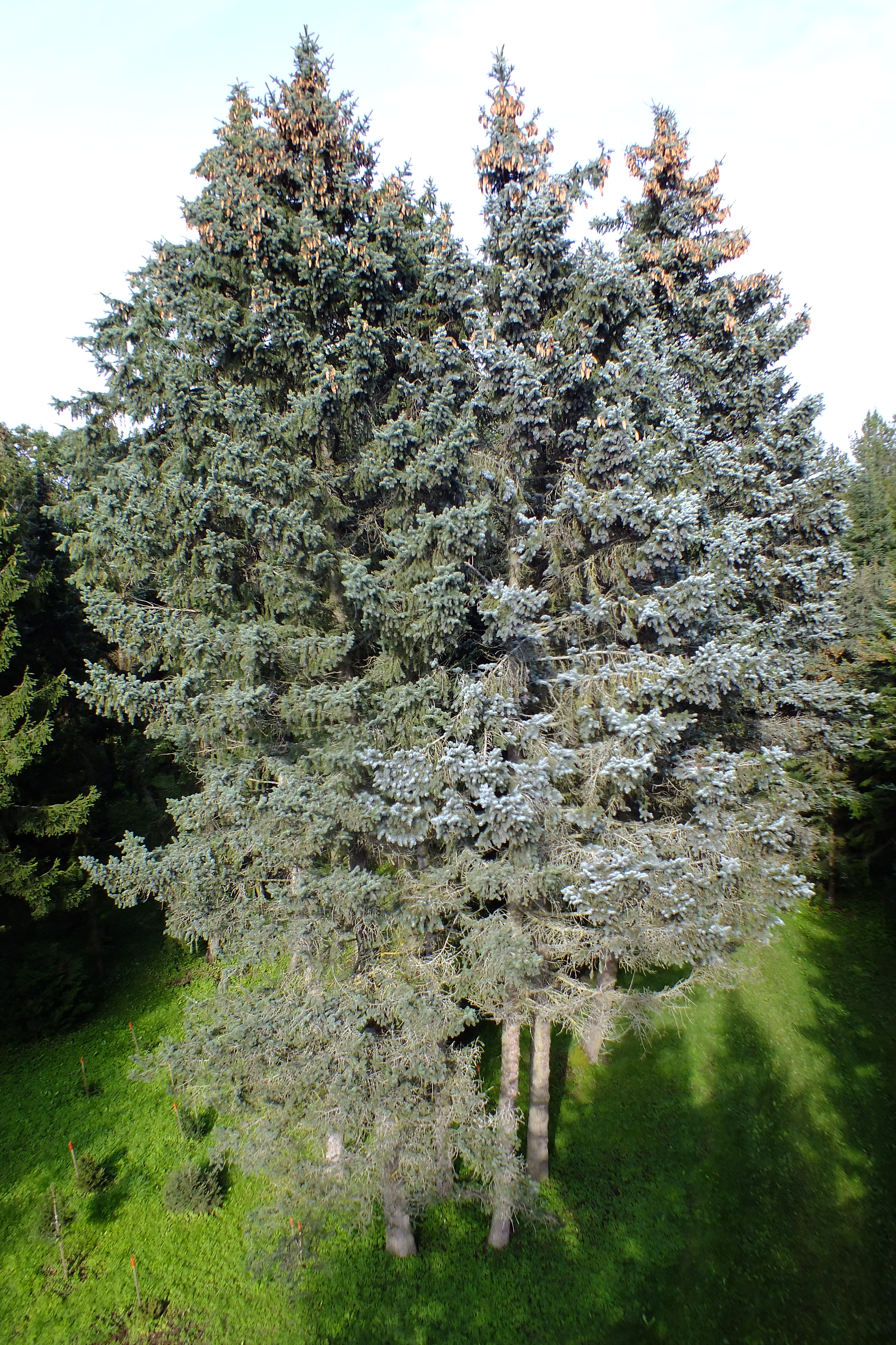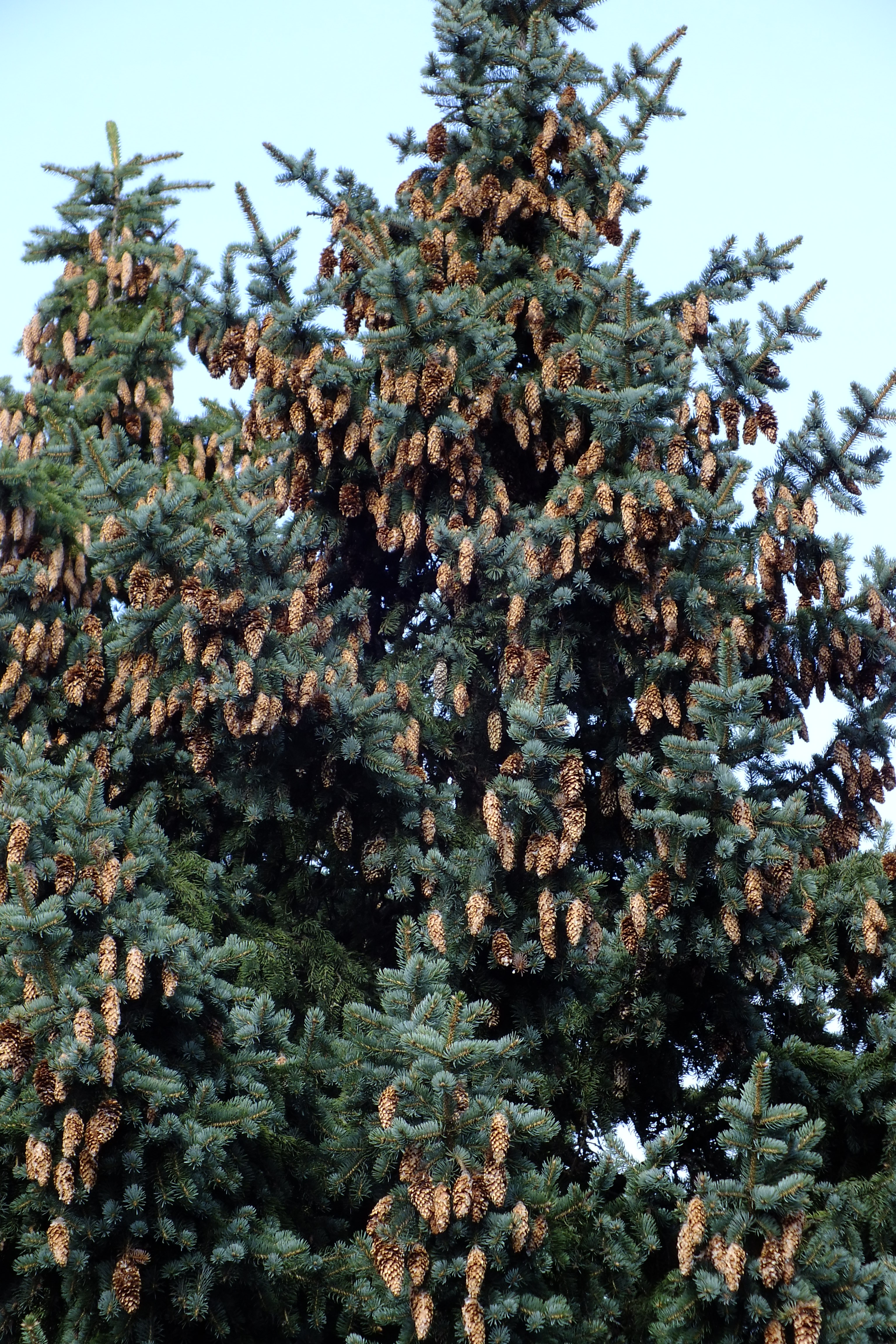 Morfoloģija. Zari stipri, jauniem kokiem šaurā leņķī pie stumbra, bet vecākiem horizontāli. Kokiem, kas ir vecāki par 50 gadiem, zari ir nokareni. Dzinumi stipri, spīdīgi, gaiši vai dzelteni brūni, kaili, ar izaugumiem. Skujas 1,6-3 cm garas, stingras, galos smailas, četršķautņainas, ar atvārsnīšu rindu uz visām šķautnēm. Skujas ir klātas ar apsarmi, tādēļ izskatās zilganzaļas, zaļganpelēkas vai bāli zaļas. Skujas ir novietotas radiāli, no ēnas vērstas uz priekšu. Čiekuri 5-11 cm gari, 3-4 cm plati, gaiši brūni. Sēklas segzvīņa ir plāna, elastīga, ar zobainu malu. Sēklas mazas, melnas.