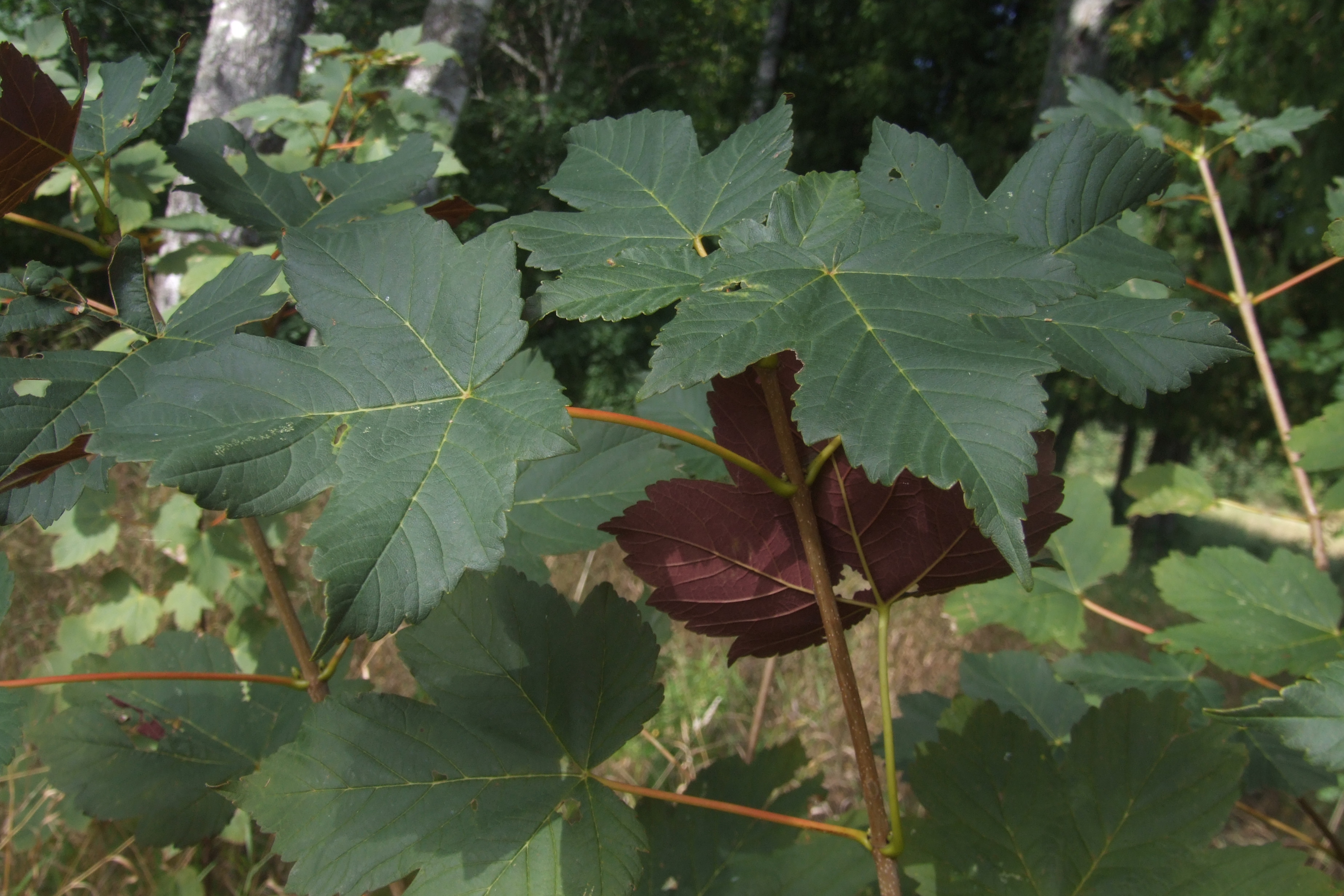 Morfoloģija. Koks līdz 25 m augsts. Lapas ar 5 daivām, 10,5-16 cm garas, 11,5-17 cm platas, virspusē tumši zaļas, apakšpusē purpurvioletas.