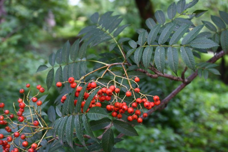 Morfoloģija. Dzinumi ir sarkanīgi. Lapas ir tumši zaļas, plūksnoti saliktas, 20-30 cm garas, ar 11-17 lapiņām, kas ir 4-7 cm garas un 1-2,5 cm platas, smailu galu un zobainu malu. Lapas kļūst sarkanas (mitrā augšanas vietā) vai purpursarkanas (mazāk mitrā augšanas vietā). Ziedi ir balti, 6-10 mm diametrā, sakopoti 8-12 cm platās vairogveida ziedkopās. Zied maijā. Augļi stāvos čemuros, sarkani.
