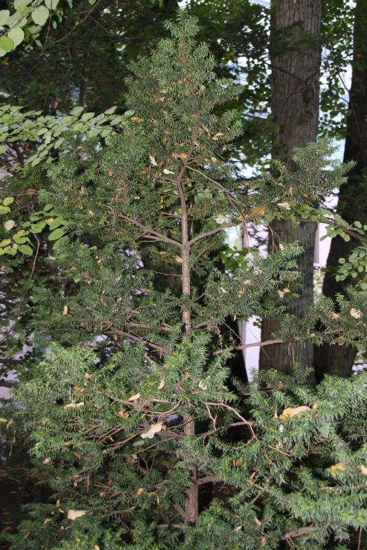 Morfoloģija. Mūžzaļš skuju koks, līdz 20 m augsts, stumbra diametrs 1-1,5 m. Koksnainie dzinumi pirmajā gadā ir zaļi, otrajā gadā kļūst dzeltenīgi brūni, bet skujas iezīmējas zaļas. Skuju apakšpuse ir dzeltena vai brūngani zaļa ar tumši zaļu malu, atvārsnītes gandrīz nav redzamas. Skuju garums – 1,5-3 (3,5) cm, platums – 2,3-3,5 (4) cm, stingras, smailas, aug uz sānu zariem taisnā leņķī pret zaru gaismā, veidojot burtu V. Augļi ir apaļi, 7-8 mm plati, gaiši sarkani. Sēkla ir olveida, nedaudz trīsstūraina vai četrstūraina.