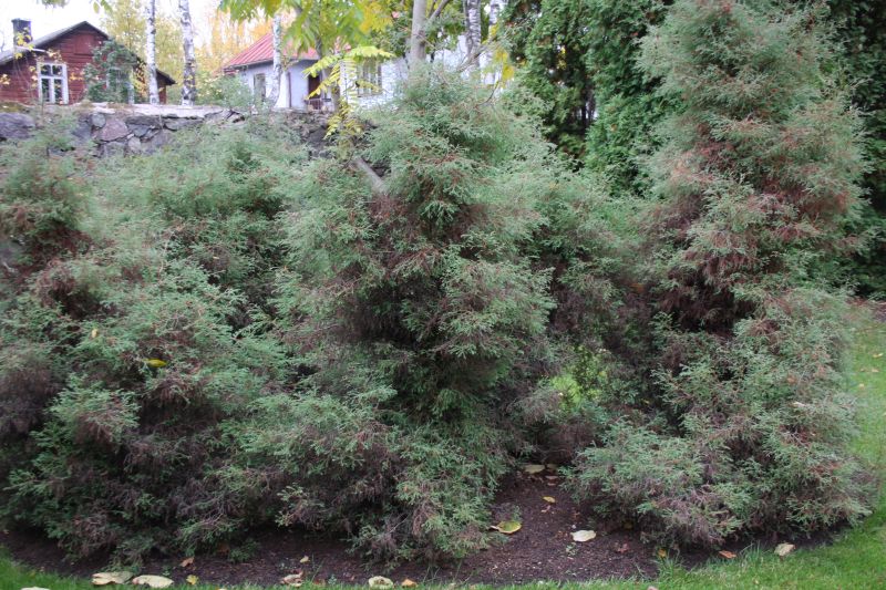 Morfoloģija. Mūžzaļš krūms, līdz l,5 (2) m augsts un līdz 1 m plats. Vainags biezs, asimetrisks, konisks. Skujas mīkstas, 6-8 mm garas un 1-5 mm platas, nepiekļaujas dzinumam. Tās ir bāli zaļas virspusē un pelēcīgi zaļas apakšpusē, ziemā brūngani zaļas līdz brūnas. Juvenīla forma, kas neveido augļus.