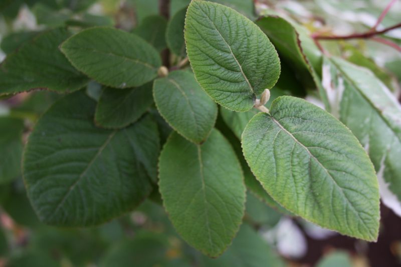 Morfoloģija. Vasarzaļš, sazarots, stāvs krūms, līdz 4 m augsts.Dzinumi ir pelēcīgi līdz brūni, klāti ar zvaigžņveida pūkām, vēlāk kaili. Lapas biezas, olveida līdz iegareni olveida, 5-15 cm garas un 3-9 cm platas. Lapas gals īss un smails, pamatne apaļa vai viegli sirdsveida, mala sīki zobaina. Lapai ir 8-13 dzīslu pāri. Lapas tumši zaļas un kailas virspusē, bet apakšpusē vilnainas. Lapas kāts 1-3 cm garš, mataini. Sausos rudeņos lapas kļūst sarkanas. Ziedi ir balti līdz gaiši dzelteni, dzinumu galos, līdz 10 cm platās ziedkopās. Zied maijā - jūnijā. Augļi eliptiski, līdz 1 cm gari, koši dzelteni, bet gatavi ir spīdīgi melni.