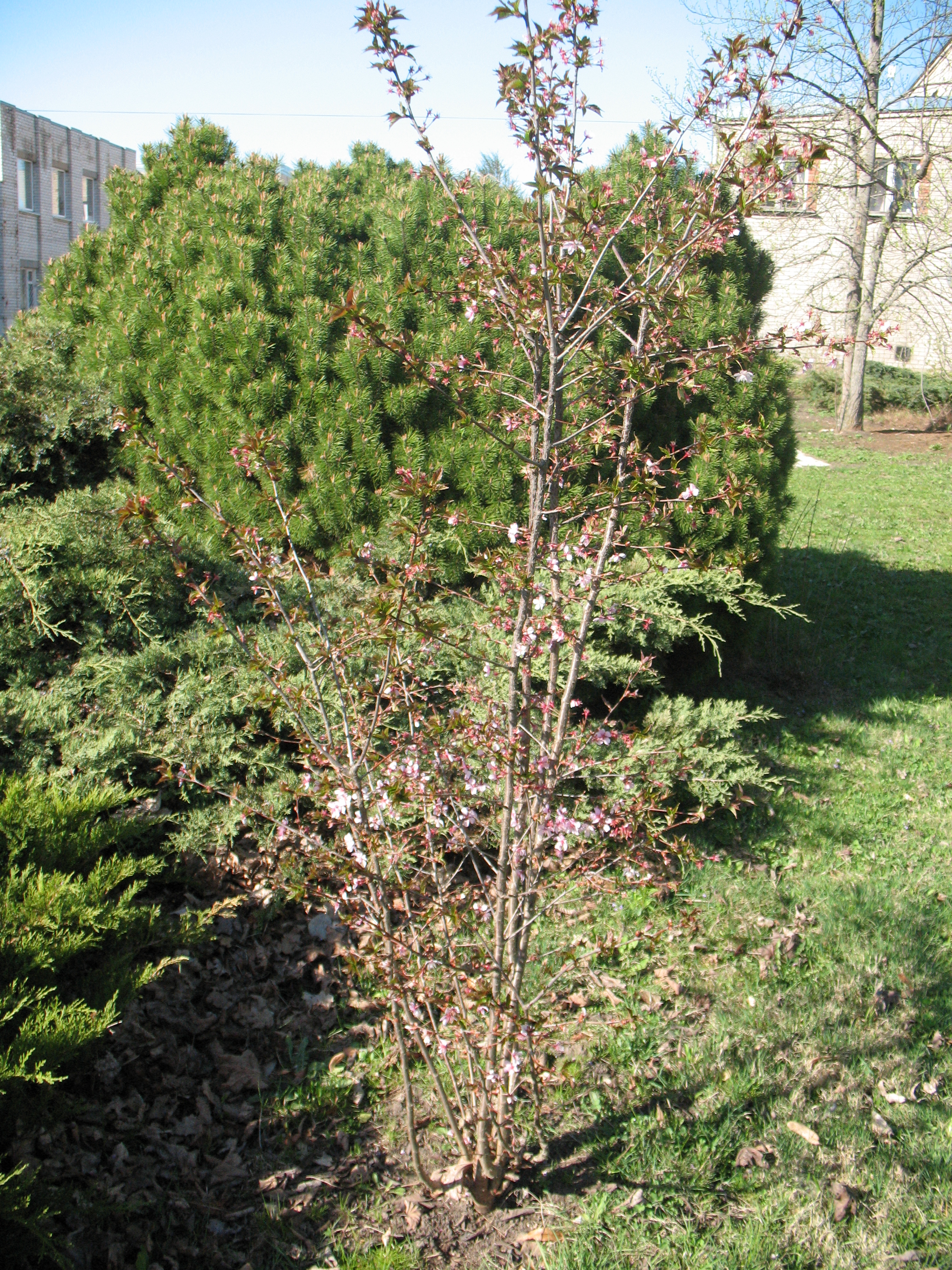 Morfoloģija. Vasarzaļš, līdz 1 m augsts, stāvs, drukns krūms. Jaunie dzinumi mataini, vēlāk dzinumi kaili. Lapas šauri olveida, ar slaidu galotni un ar ķīļveida pamatu, līdz 7cm garas un 3cm platas, rupji zāģzobainas, zobiņš ar dziedzerīti. Lapas virspuse ar iegrimušu galveno dzīslu un ar nedaudziem matiņiem, apakšpuse stipri mataina. Lapas kātiņš 9 mm garš, ar sarainiem matiņiem. Ziedi pa 1 līdz 3, balti līdz gaiši rozā, 2,8 cm plati. Zieda kāts 1,3 cm garš, ar matiņiem, tāpat kā kauslapas. Ziedgultne doba zvanveida, gandrīz kaila, sarkanīga tāpat kā kauslapas, taču zieda kātiņš vienmēr zaļš. Auglis (kaulenis) plakans, 0,7 cm garš, purpursarkans.