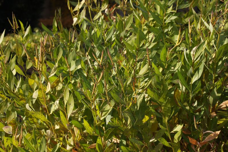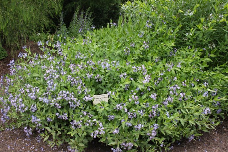 Morfoloģija. Krūmveida daudzgadīgs augs, 30-60 cm augsts. Stumbri taisni. Lapas zaļas, pamīšus, lancetiskas, 3-7 cm garas un 0,5-3,5 cm platas, mala līdzena, pamatne plati ķīļveida vai apaļa, gals smails. Ziedi gaiši vai tumši zili, zvaigžņveida, diametrs 1-2 cm, ziedkopās stumbru galos. Zied maijā – jūnijā.