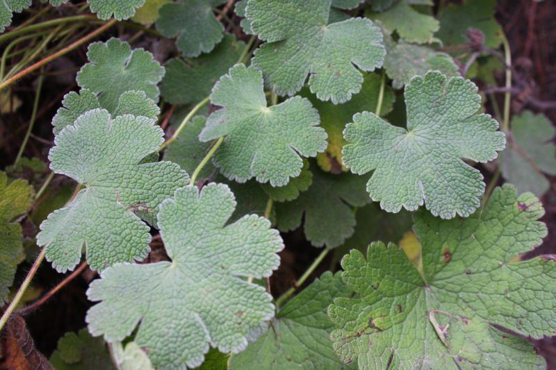 Morfoloģija. Krūmveida daudzgadīgs augs, 15-25 cm augsta. Lapas pelēcīgi zaļas, pie saknēm, apaļas, ar 5-7 daivām, līdz 13 cm platas, krokainas. Ziedi balti līdz bālā purpura krāsā, ar violetām dzīslām, līdz 3 cm plati. Zied jūnijā.