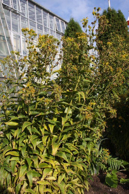 Morfoloģija. Stumbrs zarojas tikai auga galotnē, ir ļoti matains, bet var kļūt kails, parasti gaiši zaļš, saulē var būt iesarkans. Lapas zaļas, pretējas, veselas, līdz 13 cm garas un 6 cm platas, plati lancetiskas līdz ovālām, ļoti matainas, mala līdzena vai viegli zobaina. Ziedi kurvīšos, ar dzelteniem mēlziediem un stobrziediem, 5-7,5 cm diametrā, atgādina saulgriezes. Zied no vasaras vidus līdz rudenim.