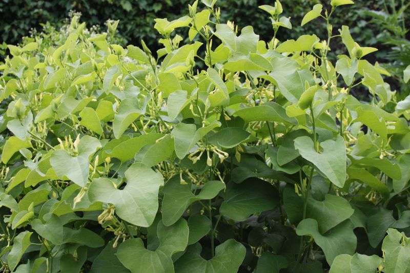 Morfoloģija. Stumbri kāpelē pa citiem augiem. Lapas zaļas, sirdsveida. Ziedi dzelteni, ar pīpes formu, pušķos. Zied vasarā.