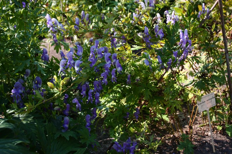 Morfoloģija. Stumbri stāvi. Lapas staraini dalītas, zaļas. Ziedi zili, balti ar zilu maliņu vai balti. Augšējā apziedņa lapa ir cepurveidīga, ziedkopas ir stumbru galotnē. Zied jūlijā – septembrī. Augļi – someņi ar daudzām sēklām.