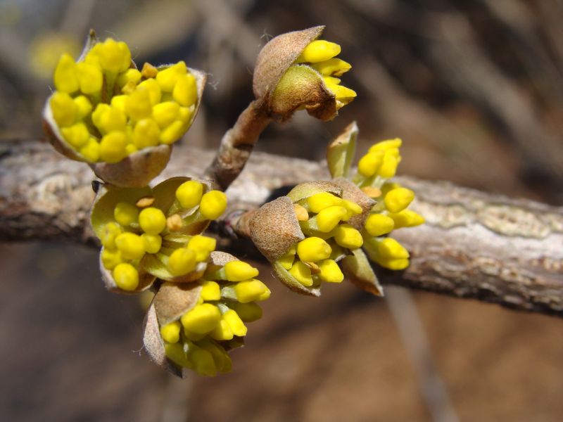 Morfoloģija. Dzinumi ir zaļi līdz brūngani, klāti ar pelēkiem matiņiem. Lapas iegareni olveida, 4-10 cm garas un 3-5 cm platas, ar smailu galu, mala viļņaina, virspuse spīdīga, apakšpuse gaišāka, 3-5 (6) pāri dzīslu ar matiņiem abās lapas pusēs. Rudenī lapas kļūst dzeltenas vai oranžas. Ziedi dzelteni, ziedkopās, bagāti ar nektāru, ko izmanto bites. Zied pirms salapošanas, aprīlī. Auglis – sarkans iegarens kaulenis, līdz 2 cm garš, ar lielu sēklu.