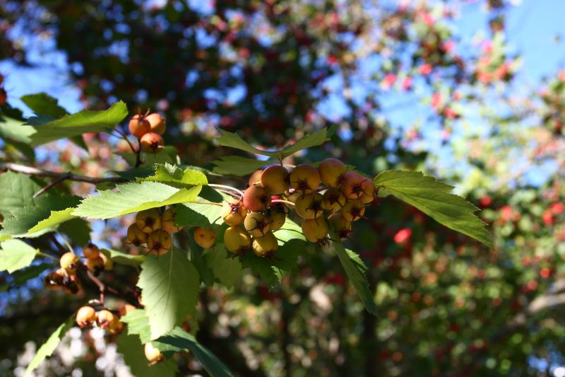 Morfoloģija. Dzinumi viegli izliekti, dzeltenbrūni. Daudz ērkšķu, kas ir 4-7 cm gari, stingri, taisni vai nedaudz izliekti, tumši brūni. Lapas tumši dzeltenzaļas, plati olveida līdz plati eliptiskas, ar 7-9 daivām, līdz 10 cm garas un 8 cm platas, matainas, kamēr jaunas, vēlāk kailas un tikai apakšpusē uz dzīslām ir matiņi. Lapas pamatne ķīļveida līdz plati ķīļveida. Mala zobaina līdz pamatnei. Lapas kāts 2-5 cm garš, sarkanīgs, matains, dažreiz ar dziedzermatiņiem. Ziedi balti, 2-2,5 cm plati, ziedkopās ar 6-15 ziediem, līdz 11 cm diametrā. Zied jūnija sākumā. Augļi spilgti karmīnsarkani, nedaudz spīdīgi, nokareni, ar bālākiem plankumiem, gandrīz apaļi, 1,5-1,8 cm gari un 1,4-1,7 cm plati.