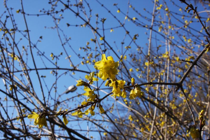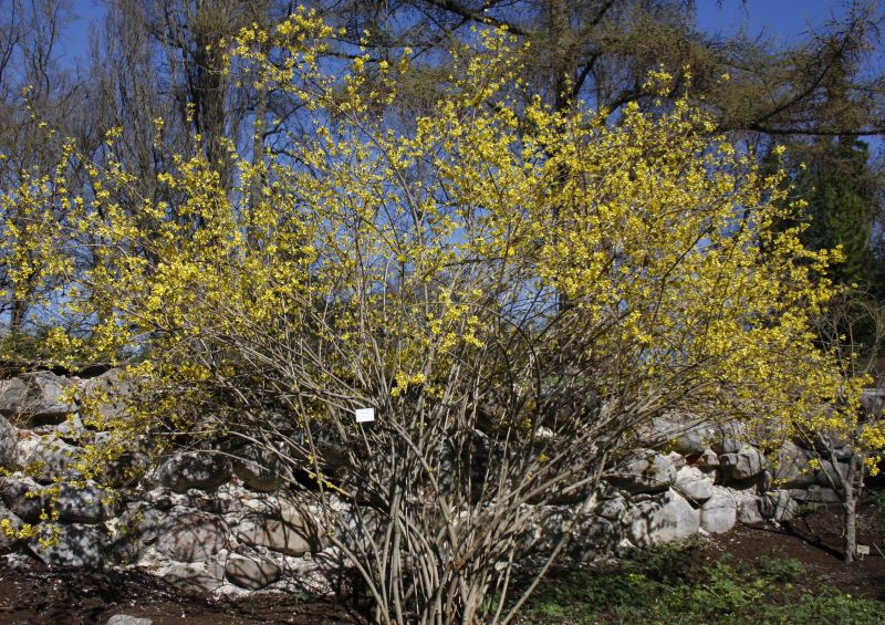 Morfoloģija. Dzinumi izliekti, dobi. Lapas iegareni eliptiskas, zaļas, 6-10 cm garas un 2-4 cm platas, ar zobainu malu, pamatne gluda. Var būt arī trīsstaraini saliktas vai lapas ar trim daivām. Lapas kāts līdz 1,5 cm garš. Ziedi zeltaini dzelteni, iekšpusē oranži, kopā 1-3 (reti 6) ziedi. Zied aprīlī- maijā. Auglis – pogaļa, kas atveras un kurā ir daudz sēklu ar spārnu.