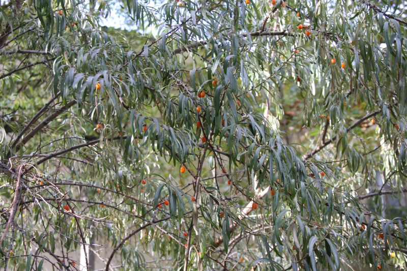 Morfoloģija. Miza nelīdzena. Jaunie dzinumi sudrabaini, vēlāk rūsgani brūni. Ērkšķi stingri, 2-7 cm gari. Lapas lineāri lancetiskas, 2-8 cm garas un 0,2-0,8 cm platas, ar strupu galu un ķīļveida pamatni, mala ieritinājusies, virspuse sudrabaini zaļa, brūngani līdz dzeltenīgi sudrabainas apakšpusē, ar plēksnēm un zvaigžņmatiņiem, gandrīz sēdošas. Ziedi sīki, ar zvaigžņmatiņiem, bagāti ar nektāru. Zied maijā. Augļi oranži, kad nogatavojušies, smaržīgi, cieši pie dzinuma. Sēklas iegarenas, līdz 0,7 cm garas, tumši brūnas.