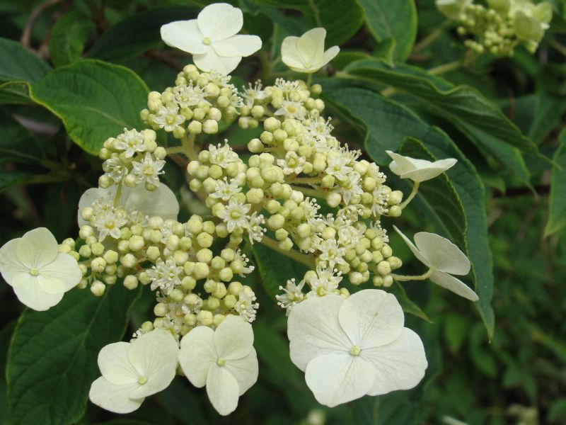 Morfoloģija. Dzinumi mataini, kastaņbrūni. Lapas olveida līdz olveida eliptiskas, līdz 12 cm garas, tumši zaļas, ar zobainu malu. Rudenī lapas kļūst brūngani dzeltenas. Ziedi pienbalti, sterilie ziedi sākumā zaļgani, tad balti, pēc tam purpura krāsā, sakopoti lielā vairogā vai skarā. Vienā ziedkopā ir ap 400-500 fertilu ziedu un ap 20 sterilu, ziedi saglabājas diezgan ilgi. Zied jūnijā – augustā. Auglis – pogaļa.