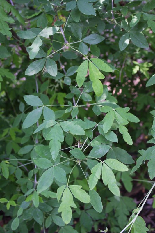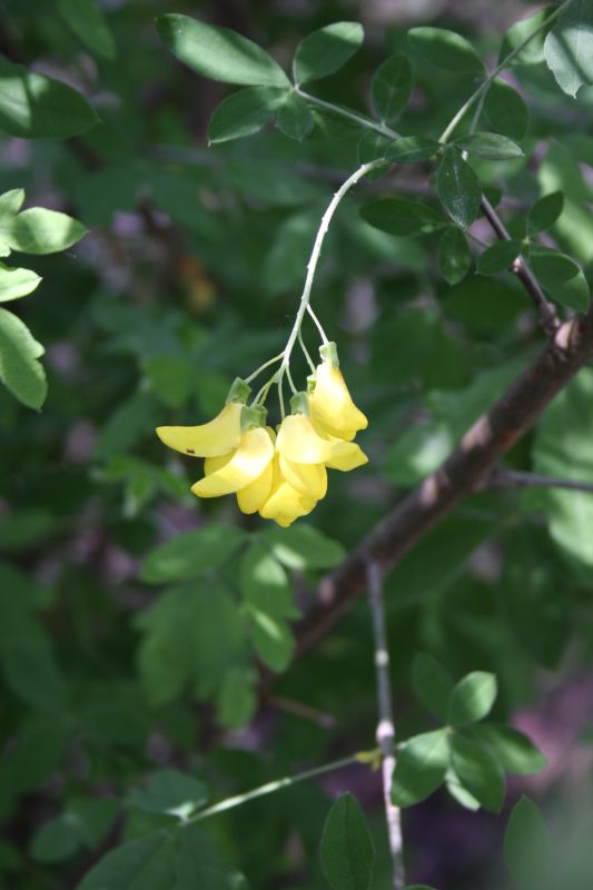 Morfoloģija. Lapas trīsstaraini saliktas, lapiņas eliptiskas, 3-7 cm garas, pelēcīgi zaļas, gals apaļš, mala apaļi zobaina. Ziedi zeltaini dzelteni, ap 2 cm gari, nokarenās galotnes ziedkopās, kas ir 12-30 cm garas. Zied jūnijā. Augļi – 5-8 cm garas pākstis.