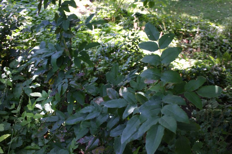 Morfoloģija. Dzinumi ir purpura krāsā. Lapas plūksnoti saliktas, parasti no (3) 5-7 lapiņām, 10-20 cm garas. Lapiņas ir plati ovālas līdz ovālas, 2,5-9 cm garas un 2-6 cm platas, ar zobainu malu, bāli zaļas virspusē, gaišākas apakšpusē, ziemā krāsu nemaina. Ziedi zeltaini dzelteni, dzinumu galos, 3-10 cm garos ķekaros ar 25-30 ziediem. Zied maijā. Augļi – tumši zilas, olveida sulīgas ogas, 0,6-1 cm garas.