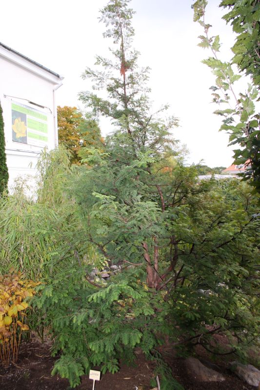 Morfoloģija. Jauniem kokiem vainags šaurs, konisks, vēlāk izplests. Skujas lineāras, gaiši zaļas, 1-3,5 cm garas un līdz 0,2 cm platas, ar strupu galu, pretēji novietotas uz dzinuma. Pēc nobiršanas rudenī zeltainā bronzas krāsā. Skujas nobirst kopā ar īsiem zariņiem. Čiekuri tumši brūni, 1,8-2,5 cm gari un ap 2 cm plati. Sēklas plakanas, ar spārnu.