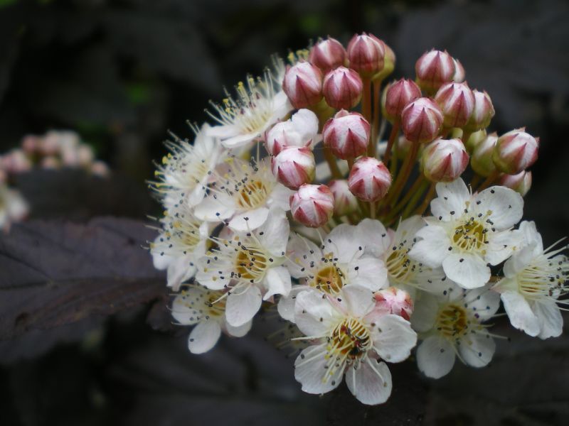 Morfoloģija. Lapas tumši sarkanas līdz melna purpura krāsā, ar trim daivām. Ziedi balti, ar sarkanu nokrāsu, vairogos dzinumu galos, līdz 5 cm diametrā. Zied maijā – jūnijā. Augļi spīdīgi, iesārti sarkani someņi.