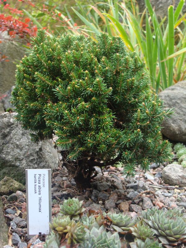 Morfoloģija. Sfērisks, kompakts augs. Skujas tumši zaļas. Pumpuri paslēpti skujās, zaru galos brūnas “pērlītes”.