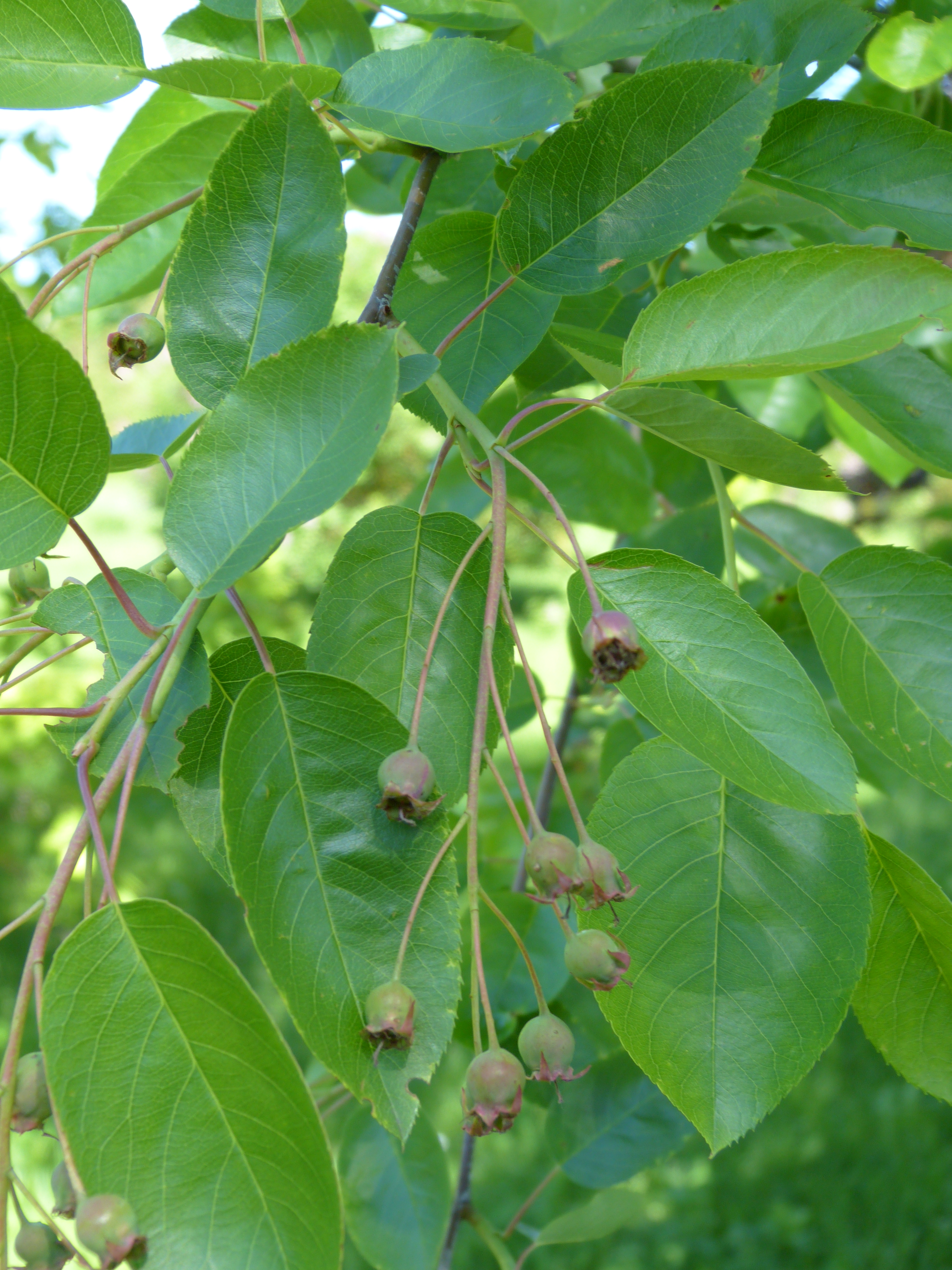 Morfoloģija. Vasarzaļš, 5-6 m augsts krūms vai koks, ar izplestu vainagu, atvases neveido, jaunie dzinumi ar matiņiem. Lapas eliptiskas, 4,5-8,5 cm garas, 2-5 cm platas, ar īsu smaili, ar ieapaļu vai sirdsveida pamatu, smalki zobainas. Lapas atveras ziedēšanas laikā, tad tās vara sarkanas, ar zīdainiem matiņiem. Lapu kāti mataini. Rudenī lapas krāsojas spilgti sarkanos un oranžos toņos. Zied maijā, ziedi balti, stāvos, skrajos ķekaros. Vainaglapas 10-14 cm garas. Augļi ķekarā pa 6-10, apaļi, 1 cm plati, ar stāvu kausu, tumši purpursarkani, saldi un sulīgi, ienākas jūnijā.