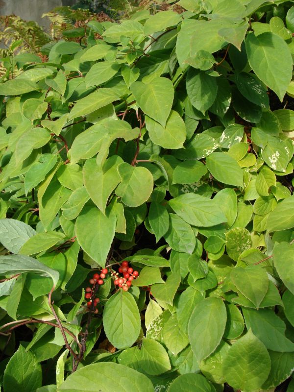Morfoloģija. Dzinumi iesārti brūni, ar zaļu serdi. Lapas zaļas, 5-10 cm garas, eliptiskas līdz otrādi olveida, ar smailu galu, nedaudz zobainu malu, gaļīgas. Kāts 1,5-3 cm garš, iesārts. Ziedi sārti vai balti, 2 cm diametrā. Zied augustā. Augļi izskatās kā ogas, ķekaros.