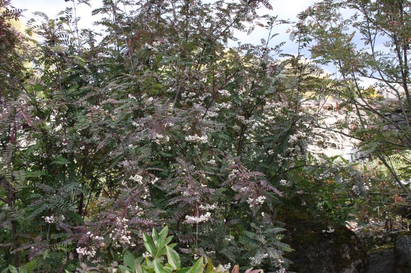 Morfoloģija. Lapas nepāra plūksnoti saliktas, 10-16 cm garas, ar 8-12 lapiņu pāriem. Lapiņas iegarenas vai iegareni lancetiskas, 1,5-3 cm garas un 0,5-1 cm platas, virspusē tumši zaļas, apakšpusē pelēcīgi zaļas, pamatne apaļa, mala zobaina. Rudenī lapas kļūst dzeltenas vai sarkanas. Ziedi vairogos. Zied jūnijā. Augļi balti, līdz 1 cm plati.