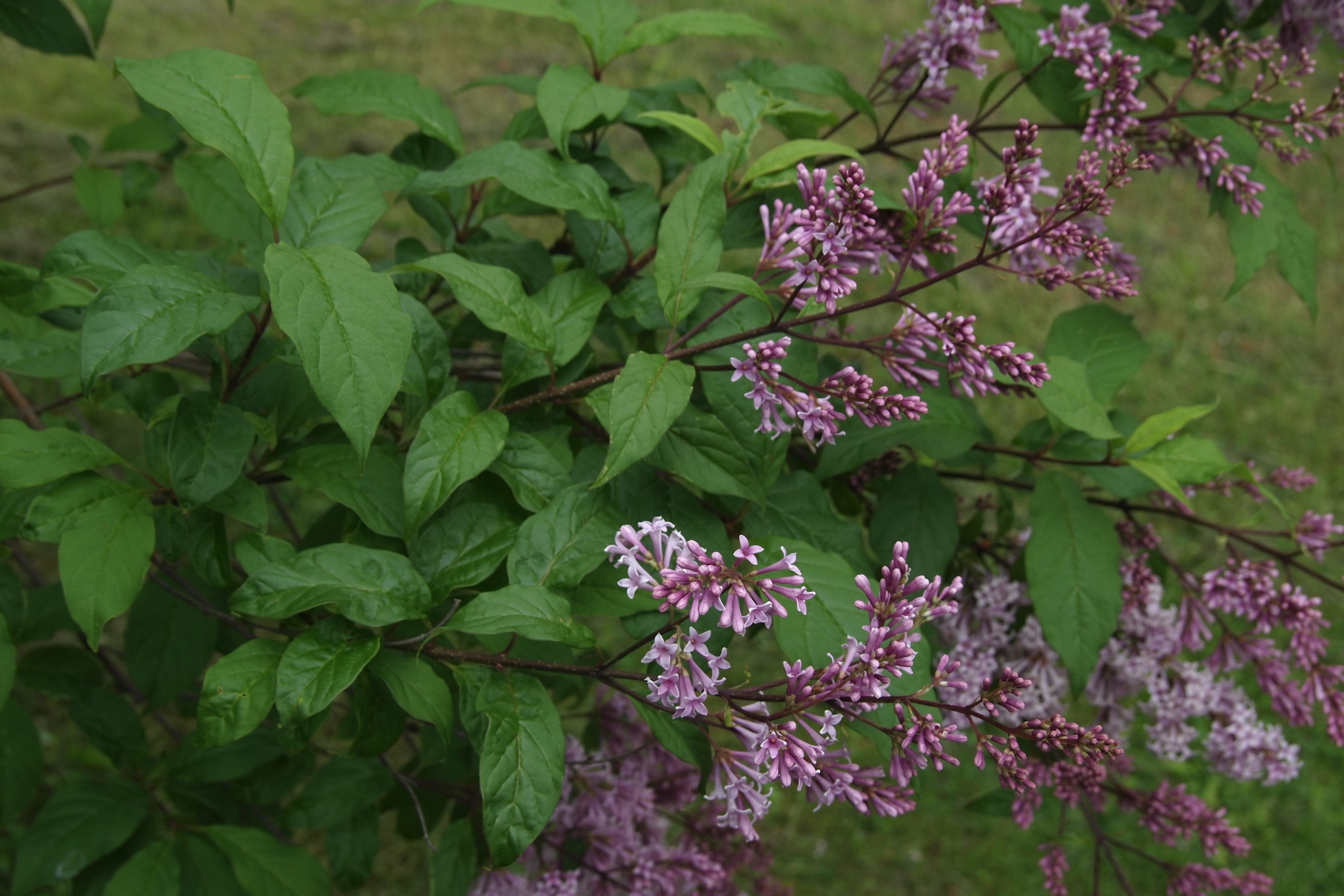 Morfoloģija. Dzinumi purpurbrūni, nedaudz kantaini, kaili vai viegli mataini. Vecākie dzinumi brūngani pelēki, ar sīkām lenticelēm, kas redzamas kā gaiši plankumi. Lapas iegareni olveida vai plati eliptiskas, 6-10 (12) cm garas un 1,5-3 (7) cm platas, ar smailu galu, ķīļveida pamatni, virspuse tumši zaļa, spīdīga, apakšpuse zilgani zaļa, ar dzīslām, galvenā dzīsla ar nedaudziem matiņiem, matiņi ir arī uz lapas malas. Ziedi tumšā purpura krāsā, smaržīgi, līdz 20 cm garās, stāvās, ciešās skarās. Zied jūnijā. Auglis – iegarena divcirkņu pogaļa, katrā cirknī pa 2 spārnotām sēklām.