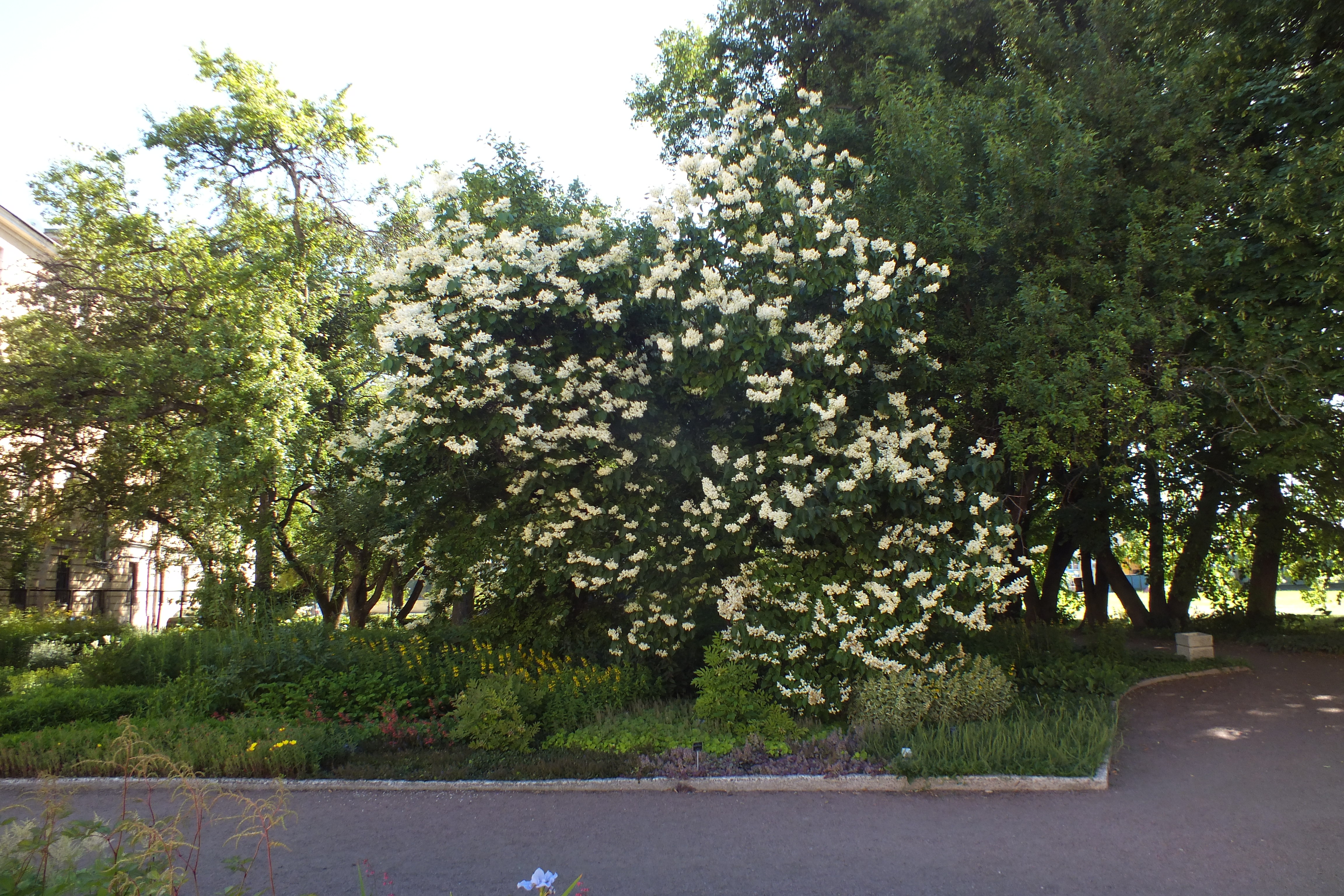 Morfoloģija. Miza ar lenticelēm, kas izskatās kā gaiši, ovāli plankumi. Lapas plati eliptiskas vai gandrīz apaļas, ar smailu galu, 8-14 cm garas un 6-8 cm platas, virspusē gaiši zaļas vai dzeltenzaļas, kailas, apakšpusē zilgani zaļas, ar mīkstiem matiņiem jaunām lapām. Ziedi balti, ar dzeltenu nokrāsu, viegli smaržīgi, līdz 30 (40) cm garās un 18 cm platās, parasti sazarotās skarās zaru galos. Zied jūlijā. Augļi – gludas pogaļas ar strupu galu.