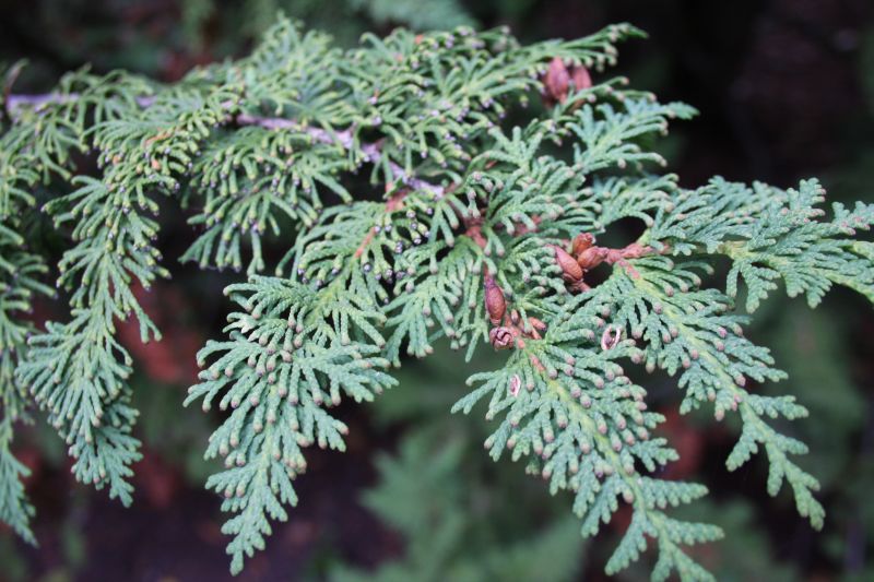 Morfoloģija. Sīkie zari aug kā biezs vēdeklis. Viegli noliekti. Skujas ir spīdīgi zaļas.