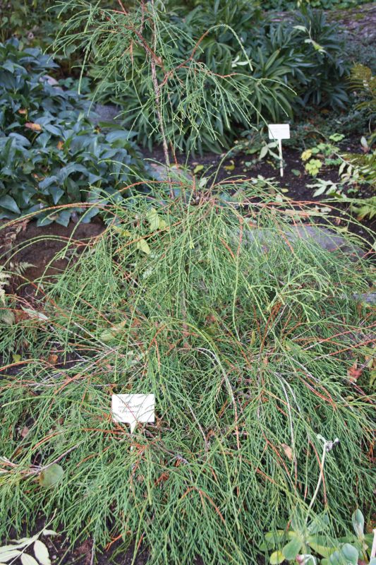 Morfoloģija. Vainags kompakts, strupa konusa forma. Dzinumi reti zarojas, tie ir gari, tievi, nokareni. Skujas zaļas.