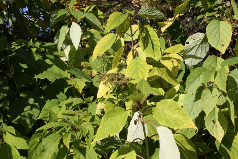 Morfoloģija. Lapas plati olveida līdz eliptiskas, 6-20 cm garas, ar īsu smailu galu, apaļu vai sirdsveida pamatni, zobainu malu, virspuse zaļa, kaila, apakšpuse zilgana, nedaudz mataina. Ziedi balti (zaļgani), 1,5-2 cm diametrā, izliektās ziedkopās ar 5-15 cm diametru. Sāk ziedēt jūnijā-jūlijā. Augļi – pogaļas ar daudzām sēklām.