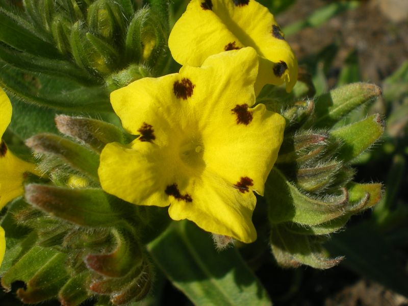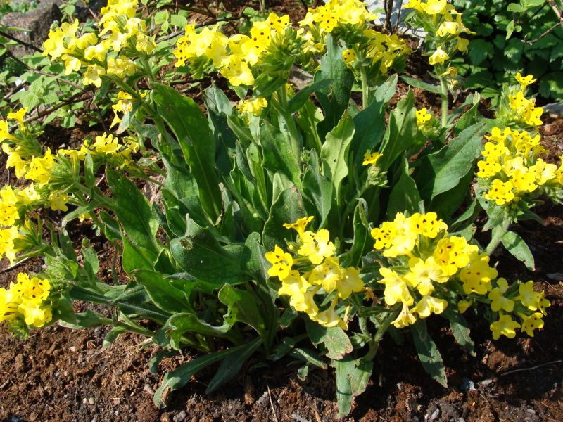 Morfoloģija. Aug 25 cm diametra spilvenu formā. Stumbri taisni. Lapas zaļas, nedaudz matainas, pretējas, lancetiskas, ar smailu galu, veselu malu. Ziedi spoži dzelteni, vainaglapas ar tumšiem punktiem, ziedi ar taures formu, stumbru galos, ziedkopās ar daudziem ziediem. Zied pavasarī.