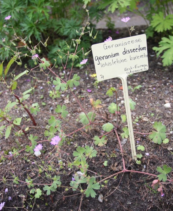 Morfoloģija. Stumbri stāvi vai pacili, zaroti, mataini, nedaudz ar dziedzermatiņiem. Kad sākas ziedēšana, piezemes lapas atmirst. Stumbra lapas pretējas, 2-4 (9) cm platas, staraini dalītas, ar 5-7 šķeltām daivām, kāts 1-9 (13) cm garš. Seglapas lancetiskas, smailas. Ziedi sarkanīgā purpura krāsā, līdz 1,5 cm diametrā. Zied jūnijā – jūlijā.