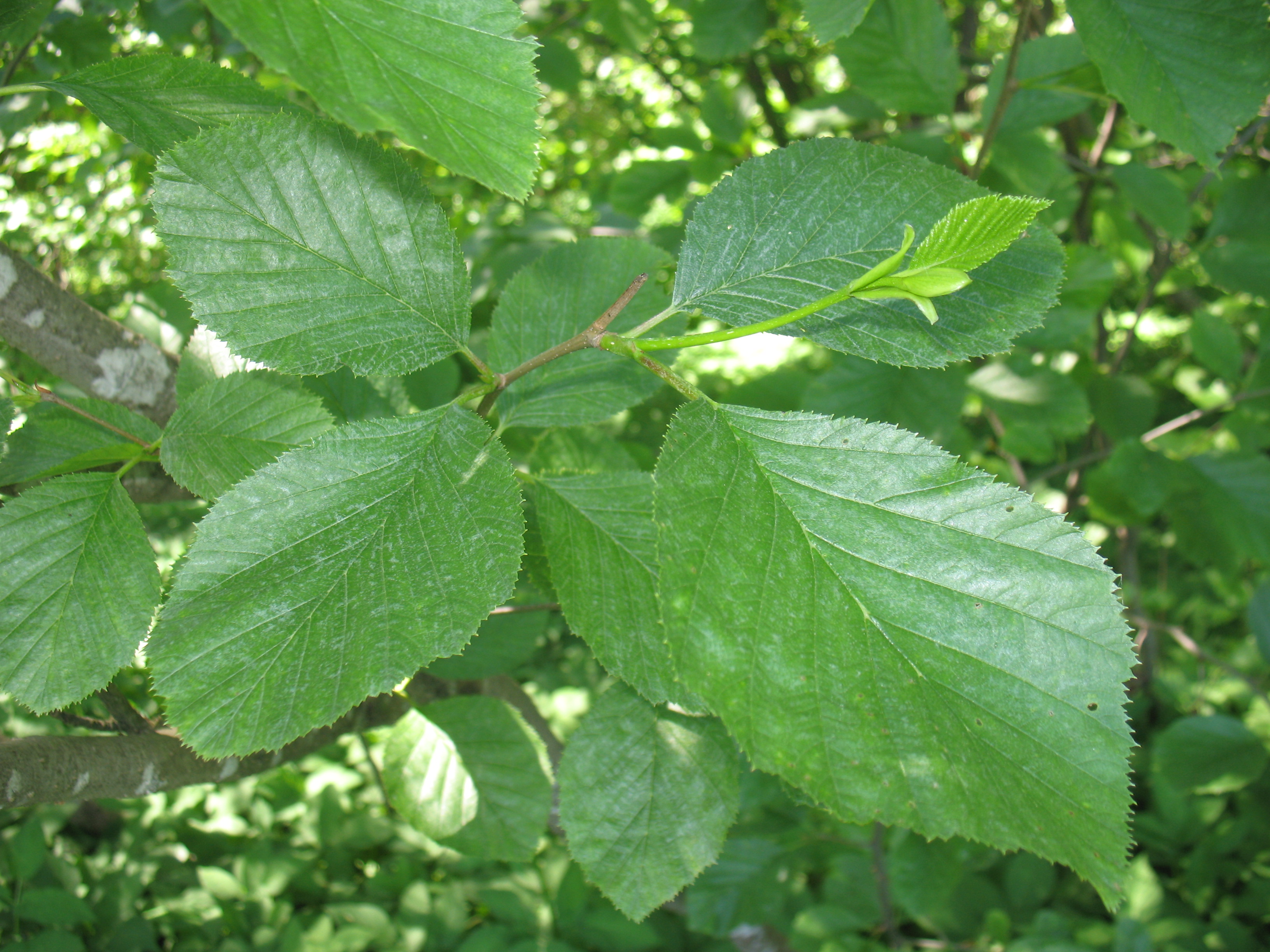 Morfoloģija. Vasarzaļš, līdz 2,5 m augsts krūms ar daudziem stumbriem. Dzinumi lipīgi. Lapas 3-6 cm garas, noapaļoti iegarenas, galotne strauji nosmailota, pamats noapaļots vai viegli ķīļveida, malas zāģzobainas, virspuse blāvi zaļa, apakšpuse dzeltenāka, spīdīga, kaila. Čiekuri pa 2-15, dzeltenbrūni, ovāli, 0,7-1,5 cm gari.