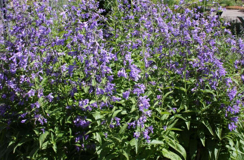 Morfoloģija. Stublāji stāvi, dziedzeraini, mataini. Lapas zaļas, viegli matainas, trīsstūraini iegarenas līdz trīsstūraini lancetiskas, apakšpusē blīvi klātas ar dzelteniem dziedzera plankumiem, ar nedaudz sirdsveida pamatu, robainu malu, asu galu, augšējām lapām 3–7 mm garš kāts, apakšējām 1.5–1.7 cm garš kāts. Ziedi zili, sakārtoti 9–15 cm garās ziedkopās. Zied augustā–septembrī.