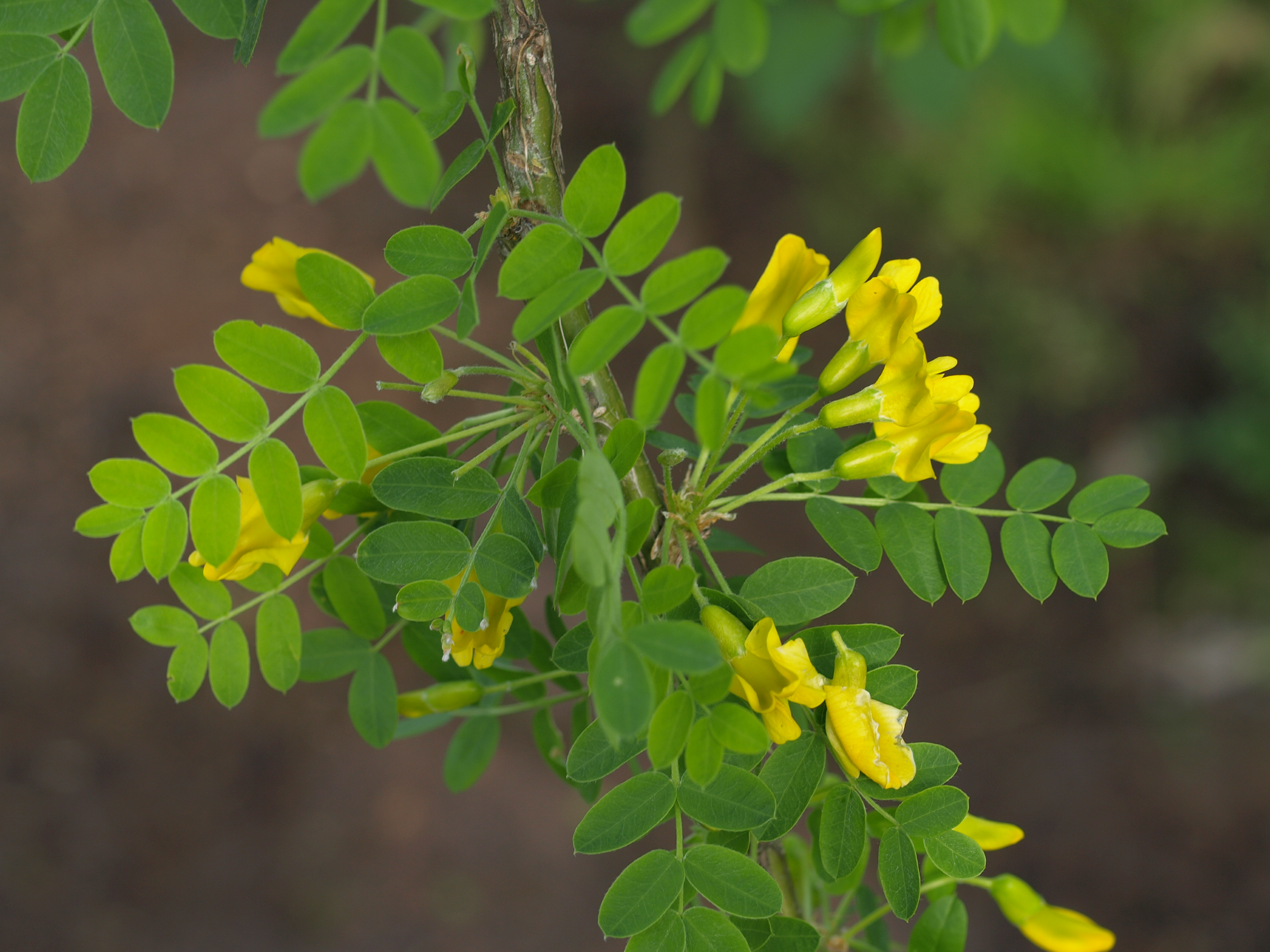 Morfoloģija. Vasarzaļš, 2,5 m augsts krūms. Vecāku stumbru miza gluda, zaļganpelēka, spīdīga, jaunie dzinumi zaļi, brūnganzaļi vai pelēki, tievi, lokani, ar piegulošiem matiņiem. Lapas līdz 10 cm garas, ar 4-7 lapiņu pāriem. Lapiņas otrādi olveida vai iegareni eliptiskas, 8-35 mm garas, abos galos noapaļotas, galotnē ar īsu dzelonīti, gaiši zaļas, jaunās ar zīdainiem matiņiem, nobriedušās gandrīz kailas. Pieziedlapas pēc lapu nobiršanas top cietas. Ziedi dzelteni, pa vienam vai retāk pāros. Kauss zvanveida, ap 6 mm garš, matains, ar platiem zobiem. Pākstis lineāri cilindriskas 3,5-6,5 cm garas, ar 5-8 sēklām. Zied maijā, jūnijā.