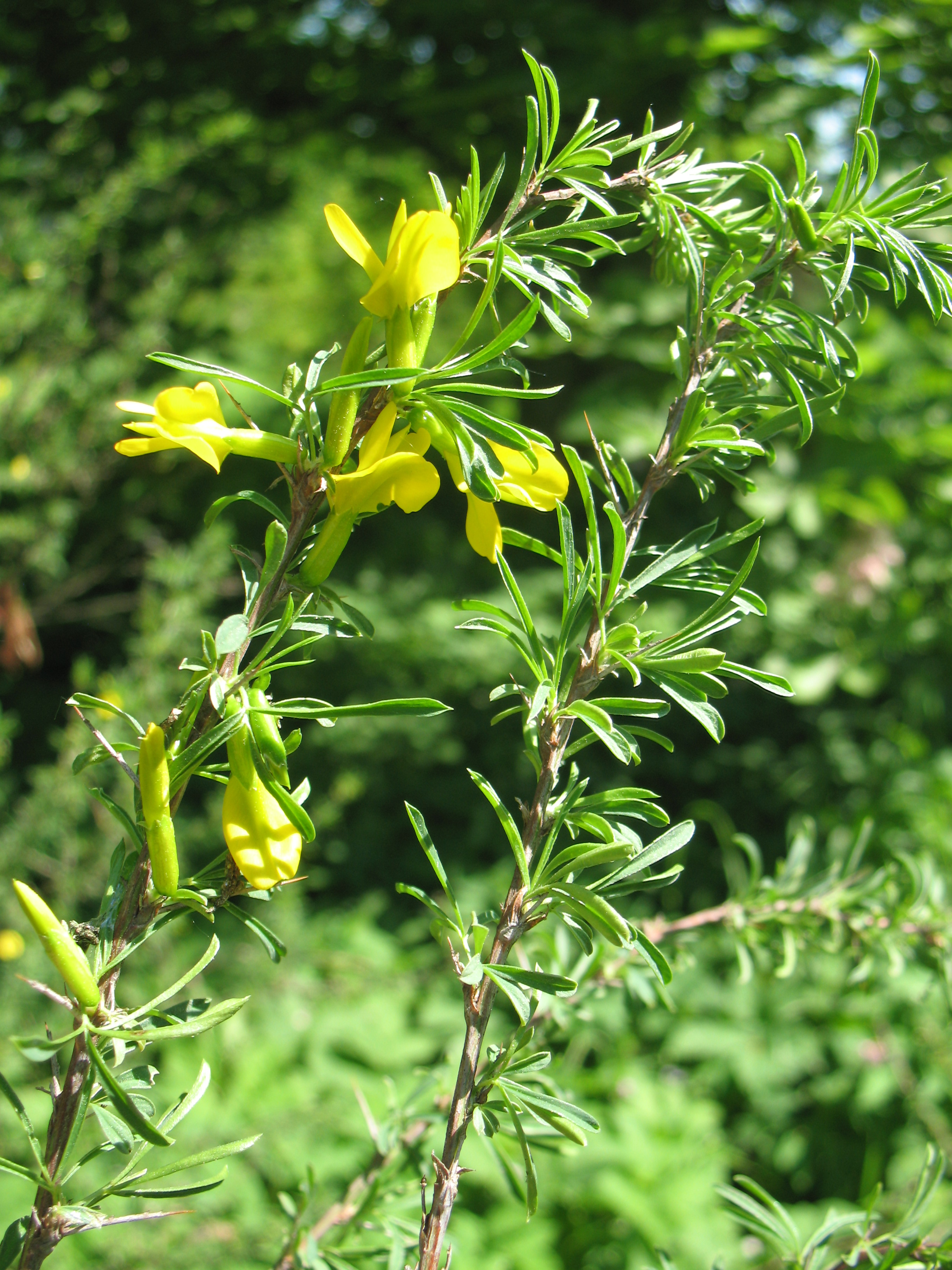 Morfoloģija. Vasarzaļš, izplests vai stāvs, stipri sazarots, 0,25 – 2 m augsts krūms. Miza zaļgandzeltena, ar gareniskām korķainām joslām. Jaunie dzinumi mataini. Lapas uz garvasām ar 2-4 lapiņu pāriem, uz īsvasām ar 2 pāriem. Lapiņas šauri otrādi olveida, 7-23 mm garas, ar dzelonīti galotnē, ar retiem piegulošiem matiņiem. Uz garvasām 1,5-6 cm gari dzeloņi, kas ir pielapu pārveidnes. Ziedi pa 1, dzelteni, 2-2,5 cm gari. Kauss 7-10 mm garš, kails ar skropstainām zobiņu malām. Pākstis 2-2,5 cm garas. Zied no maija līdz jūlijam, augļi ienākas no augusta līdz oktobrim.