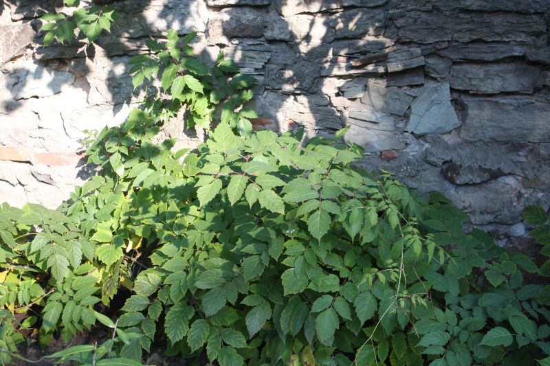 Morfoloģija. Dzinumi cilindrveida. Lapas tumši zaļas, pat plūksnaini saliktas, apakšējais lapu pāris parasti trīskāršs vai reti plūksnains, lapiņas iegarenas vai iegareni eliptiskas, 4–12 cm garas un 2–6 cm platas, ar sirdsveida pamatu, malai ir 3–15 robojumi katrā pusē, diezgan ass gals. Kāts 3–8 cm garš, lapiņām ir 1–3 cm garš kāts. Rudeņos lapas kļūst dzeltenoranžas līdz sarkanas. Ziedi zaļgani. Sakārtoti vairogos. Zied vēlā vasarā. Augļi ir lodveidīgi, nedaudz iegareni, 6–10 mm plati, sarkani, tumši violeti līdz melni.