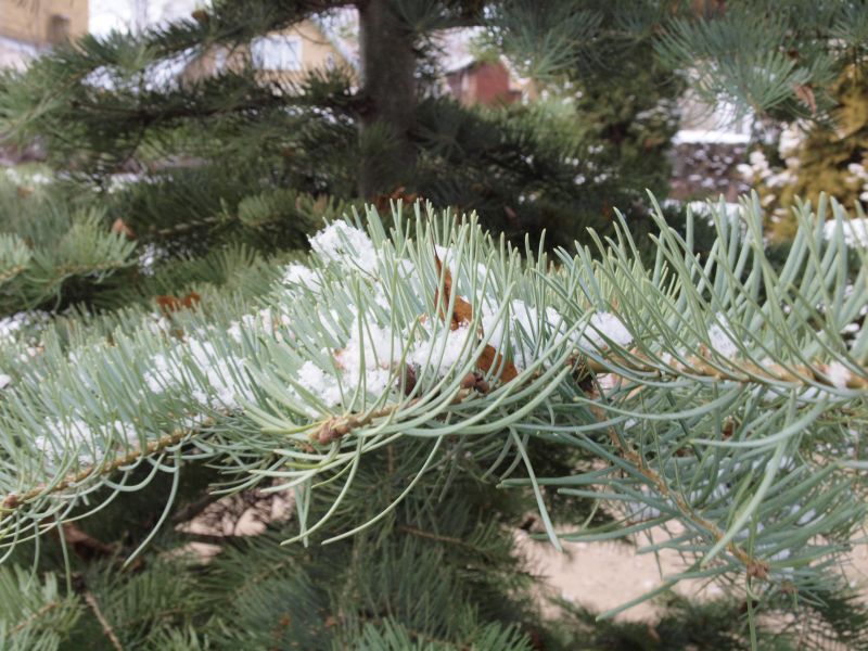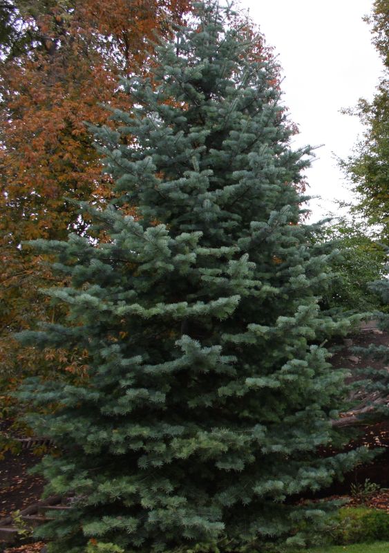 Morfoloģija. Vainags konusveida, palieks trulāks, kad kļūst vecāks. Zari piestiprināti taisnā leņķī. Miza pelēka, gluda, ar sveķu ailēm, vēlāk nelīdzena, biezāka (līdz 18 cm bieza), stīva, korķaina un ugunsdroša, pelnu pelēka. Dzinumi brūngana zaļi pirmajā gadā, skuju pamatus ieskauj brūns riņķis. Otrā gada dzinumi zaļgani pelēki, nesegti, ar plāniem virsmas ķeksīšiem. Skujas diezgan asas, bez šķēluma, nav smailas, 3–7.5 cm garas un 2–3 mm platas, blāvi zilgani pelēkas līdz pelēcīgi zaļas no abām pusēm, tām ir atvārsnītes un vasks abās pusēs, nedaudz izliektas. Vīrišķie čiekuri zaļgani vai violeti. Čiekuri cilindrveida, 7–13 cm gari un 3–4.5 cm plati, ar apaļu galu un pamatu, vasaras laikā zaļi, var būt arī violeti, pelēcīgi brūni, kad gatavi. Aizsargājošās bruņas nav redzamas. Sēklu bruņas 2.5–3 cm platas, nedaudz īsākas, platas, izliektas un matainas.