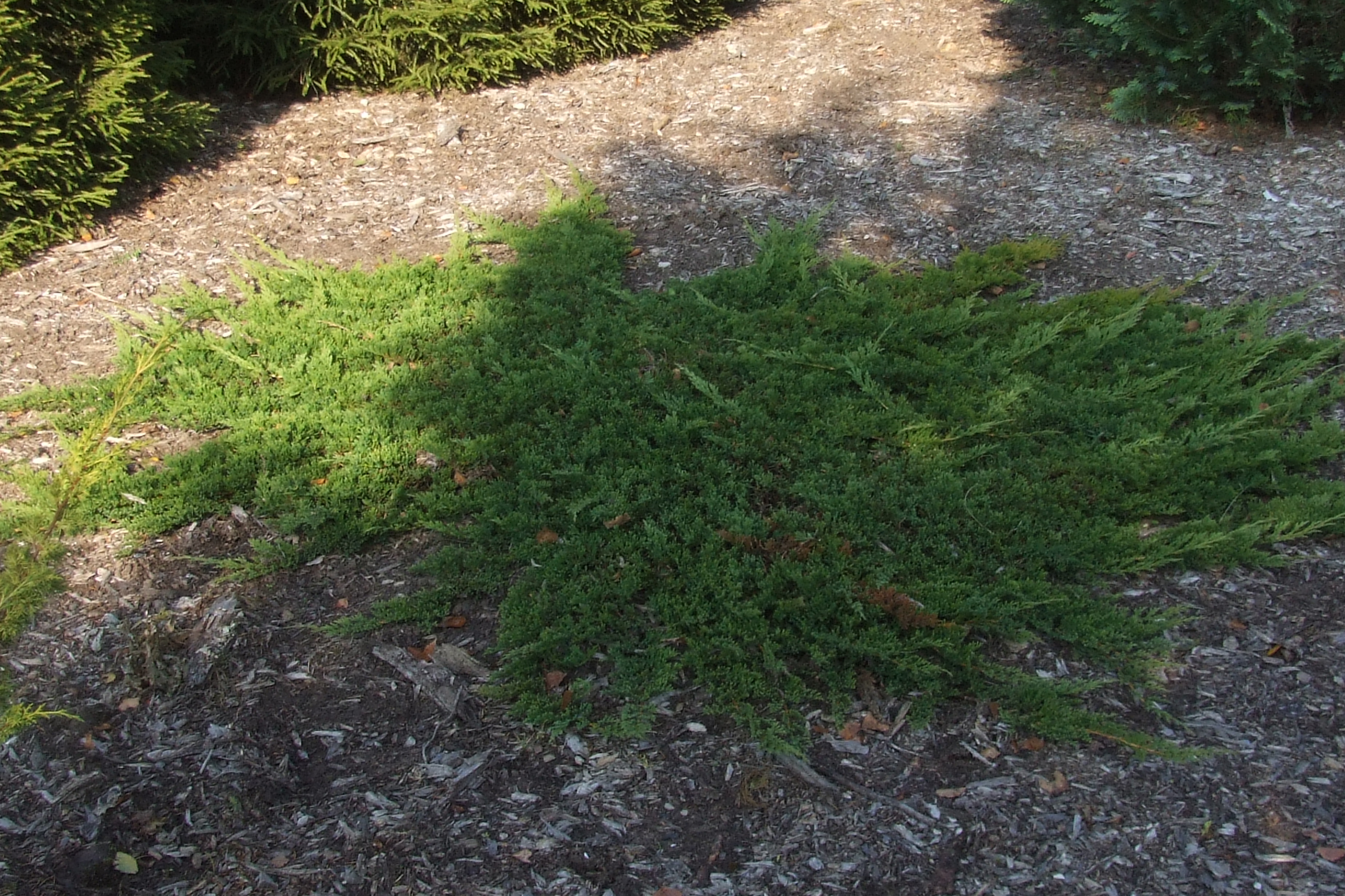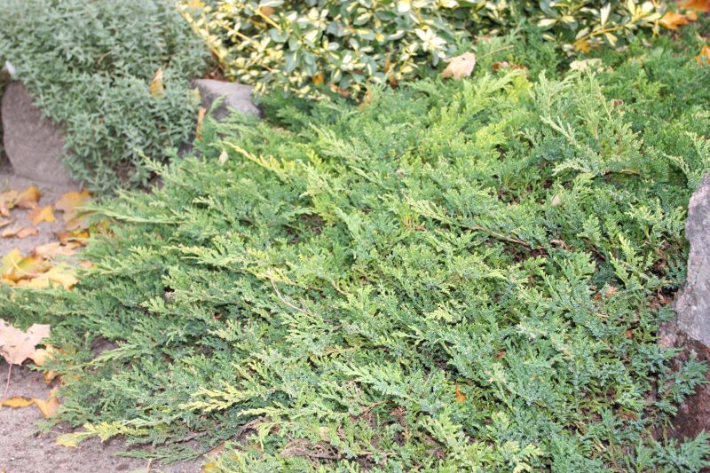 Morfoloģija. Dzinumu gali stāvi. Skujas zilgani zaļas, ļoti īsas. Ziemas laikā mazliet violetas.
