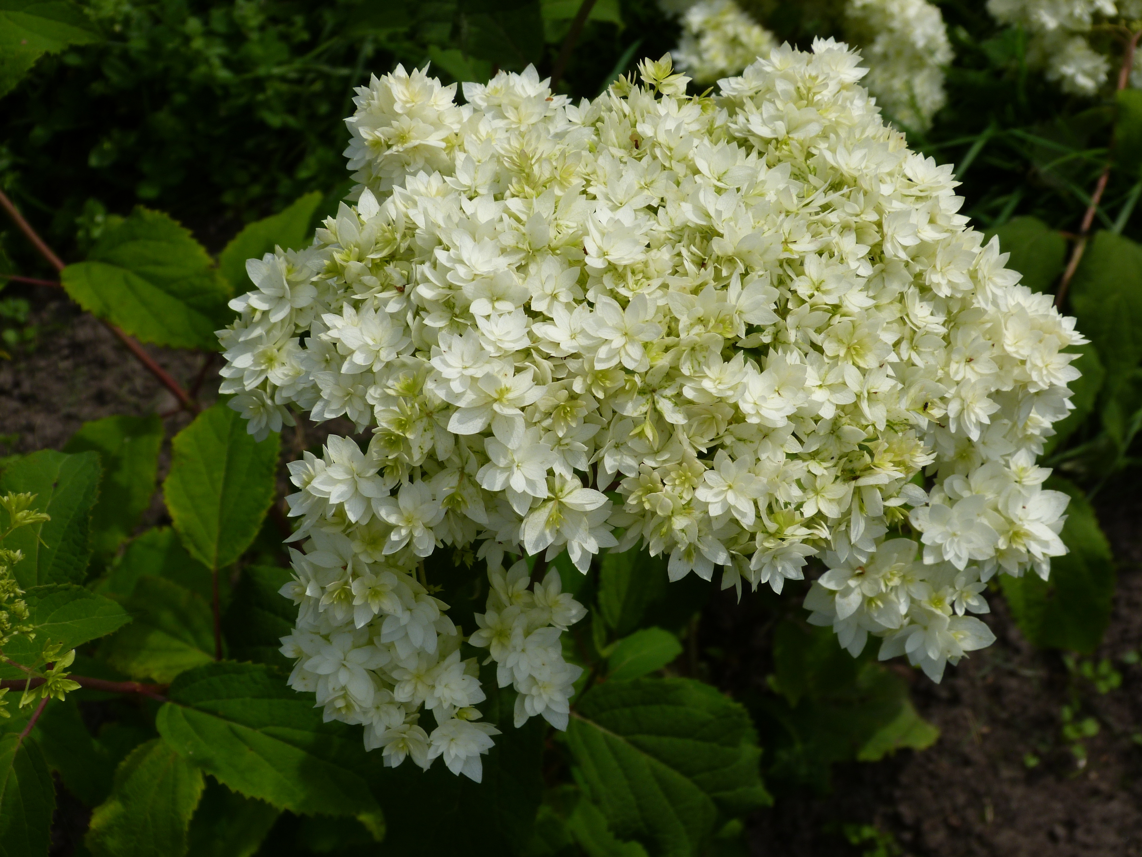 Morfoloģija. Līdz 1,8 m augsts, kompakts krūms. Ziedkopas lielas, gandrīz bez fertilajiem ziediem. Ziedi pildīti, zaļganbalti. Zied no jūlija līdz septembrim.