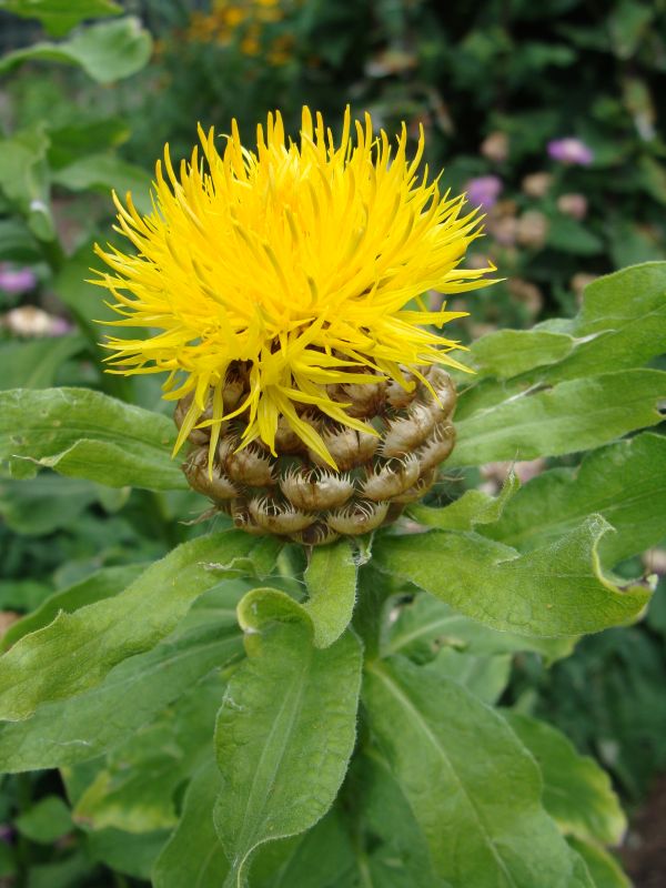 Morfoloģija. Stublāji stāvi, stingri, rievaini, nezarojas, blīvi klāti ar lapām. Lapas vienkāršas, ar veselām vai viļņainām/zobainām malām. Apakšējās lapas plati lancetiskas, ar īsu kātu, stumbra lapas iegarenas, augšējās lapas lineāras. Ziedu kurvīši lieli, gandrīz lodveida, līdz 9 cm diametrā. Stobrziedi zeltaini dzelteni, visi vienāda lieluma. Zied jūlijā – augustā. Auglis – sēklenis.