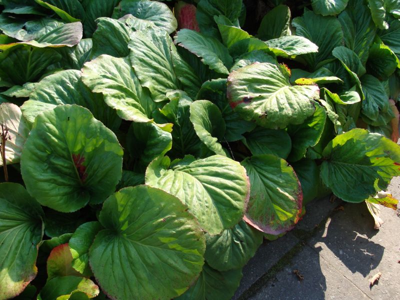 Morfoloģija. Lapas rozetē, ziemzaļas, ādainas, isrdsveidīgi ovālas, ar viļņainu malu, izteiktām dzīslām, nelīdzenas, virspusē koši zaļas. Ziedi purpurkrāsas-sārti, blīvā, nokarenā čemurā. Zied maijā, jūnijā. Auglis – pogaļa. Daudz sēklu.
