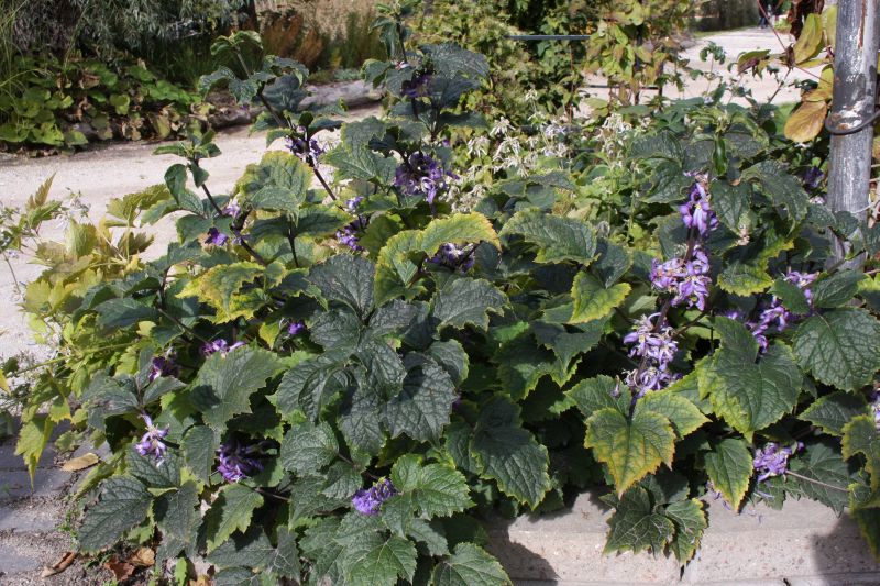 Morfoloģija. Stumbri parasti zarojas. Lapas trīsdaivainas, ar 2,5-14 cm garu kātu, plūksnas plati olveidīgas, piecstūrveidīgas, gandrīz apaļas, eliptiskas vai olveidīgas, 2,5-16 cm garas un 2,5-14 cm platas, plānas kā papīrs, nereti trīsdaivainas, ar matiņiem, ar apaļu vai plati ķīļveidīgu pamatni, ar zāģzobainu malu un īsu, smailu vai slaidi smailu galu. Ziedi smaržīgi, zili, līdzīgi hiacinšu ziediem, žāklēs un skarās. Zied augustā, septembrī.