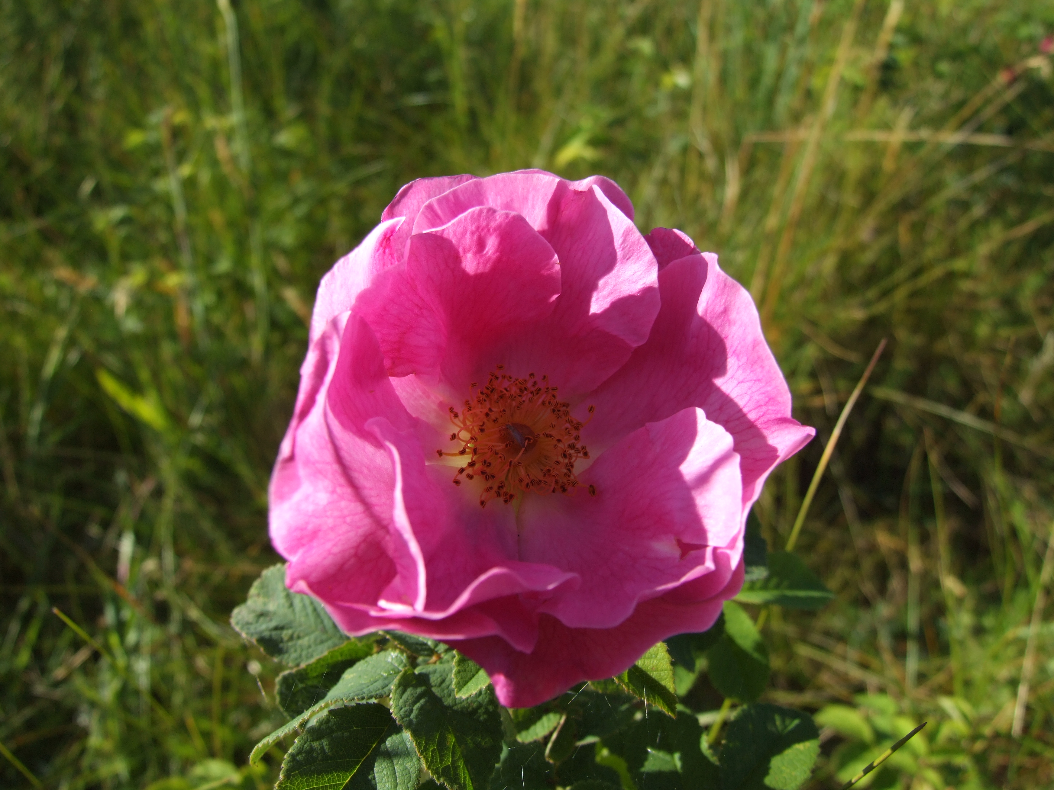 Morfoloģija. Vasarzaļš, parasti ne augstāks par 50 cm krūms ar spēcīgi attīstītiem sakneņiem, no kuriem paceļas ziedošie zari. Dzeloņi dažāda lieluma, sīkākie arī ar dziedzerīti galā. Lapas 3-5, ar salīdzinoši lielām, 3-3,5 cm garām, ādainām lapiņām ar izteiktu dzīslojumu. Ziedi galvenokārt pa vienam, ziedkāti gari un spēcīgi, un tāpat kā ziedgultne, klāti ar kātainiem dziedzeriem. Ziedi 4-6 cm plati, vainaglapas sarkanas, irbulis ar matiņiem. Auglis apaļš vai olveida, ap 1,5 cm plats, pasauss.