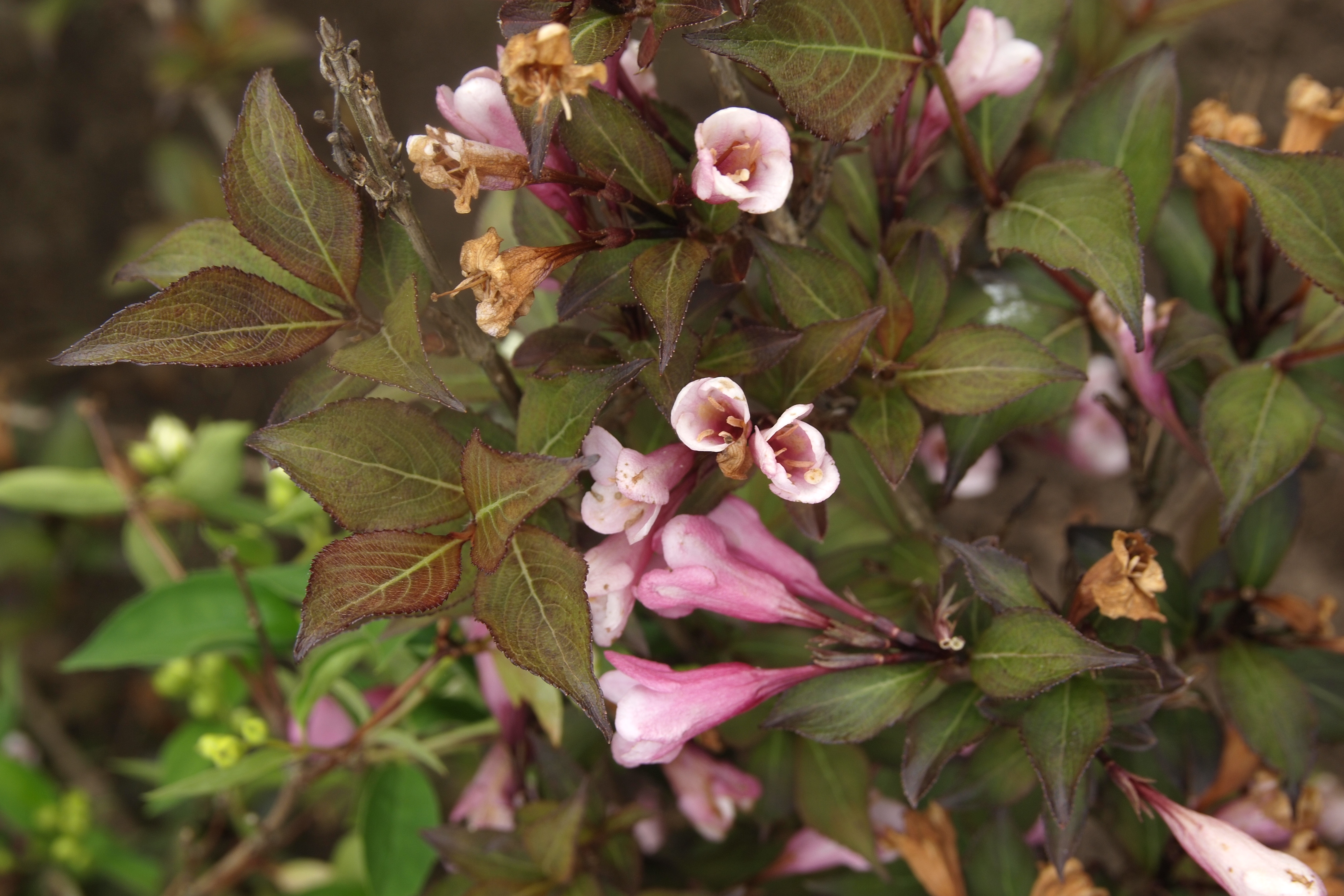 Morfoloģija. Lapas brūngani sarkanas, eliptiskas, iegareni olveida, ar smailu galu, ar robainu malu. Ziedi tumši rozā, plaši zvanveida. Zied maijā – jūnijā.